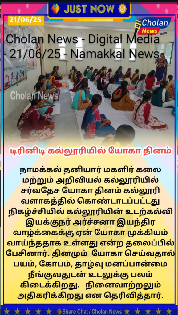 In this regard, Mrs. V. Archana, Physical Director & Coordinator – Yoga and Meditation Club, Trinity College for Women, Namakkal, delivered a topic entitled “Why yoga is very important for machine life?” (இயந்திர வாழ்க்கையில் ஏன் யோகா மிகவும் முக்கியம் வாய்ந்ததாக உள்ளது?)