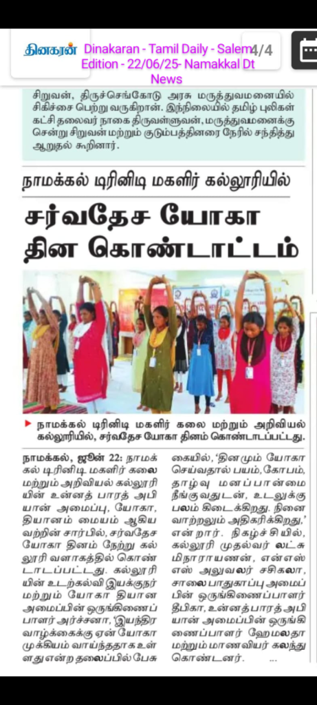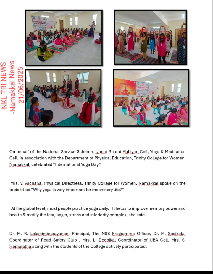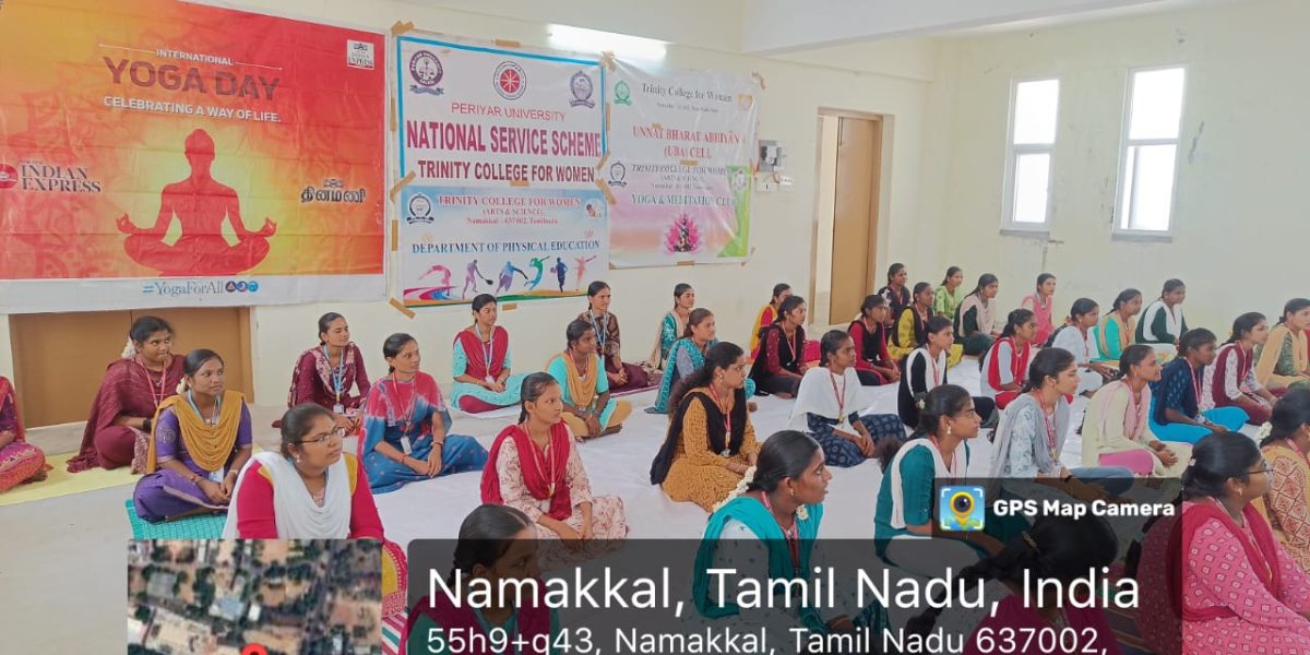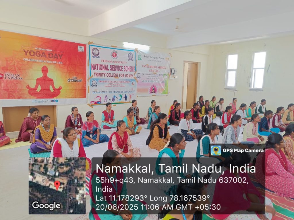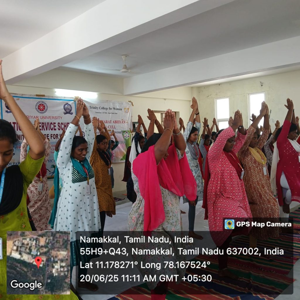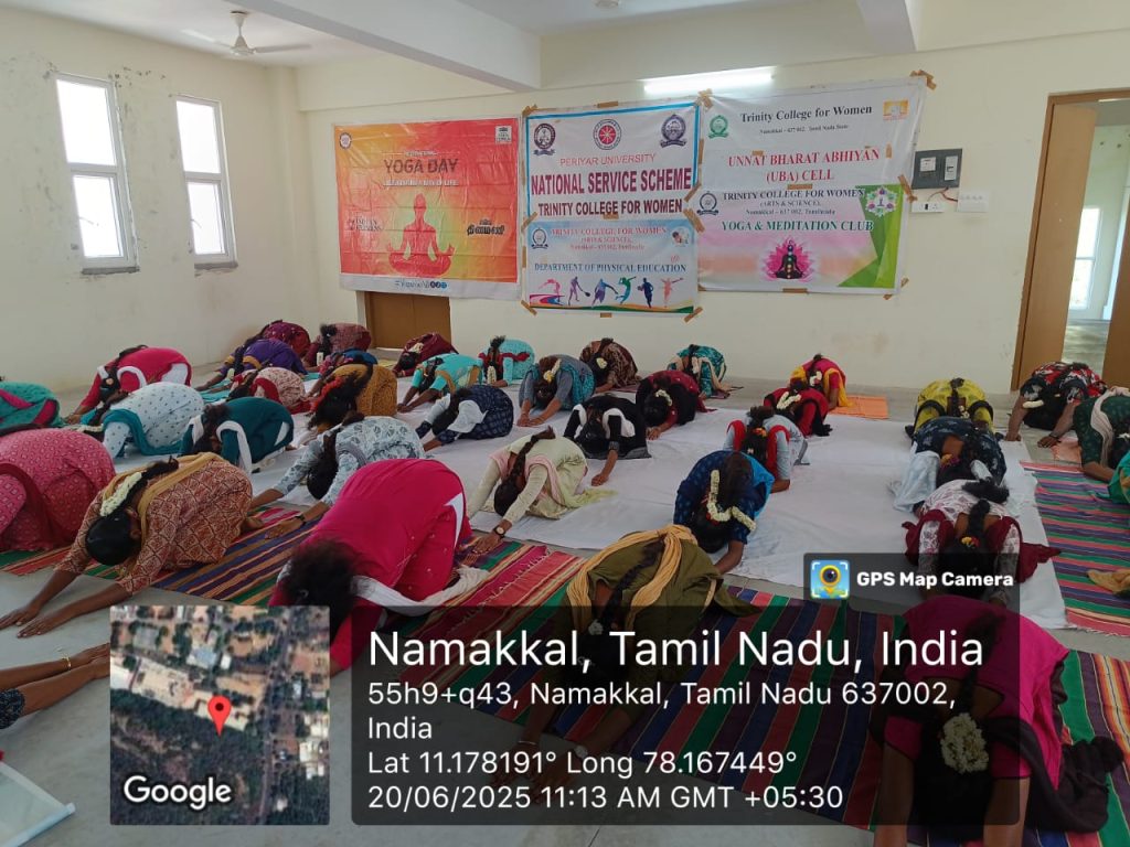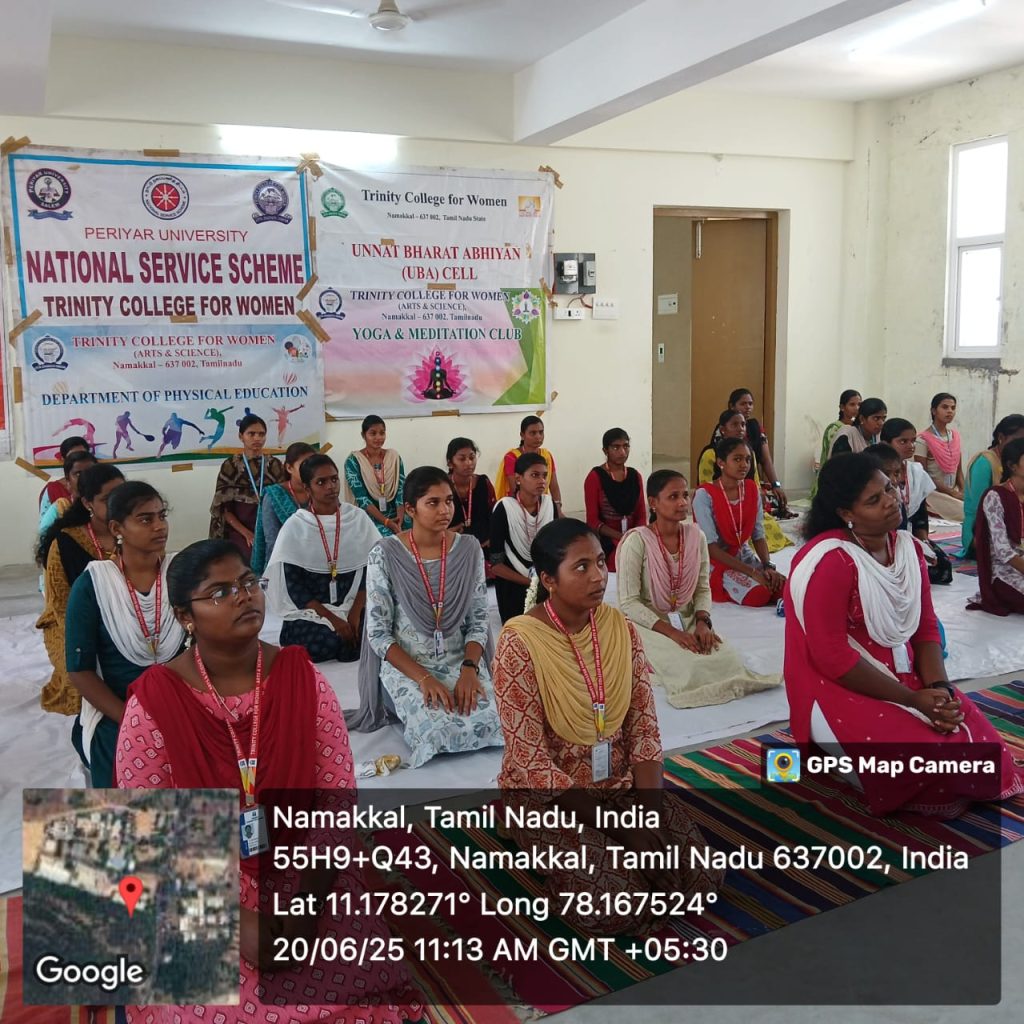 The National Service Scheme, Unnat Bharat Abhiyan Cell and Yoga & Meditation Club, in support of the Department of Physical Education, Trinity College for Women, Namakkal, celebrated Yoga Day on 20th June 2025 on the College premises.