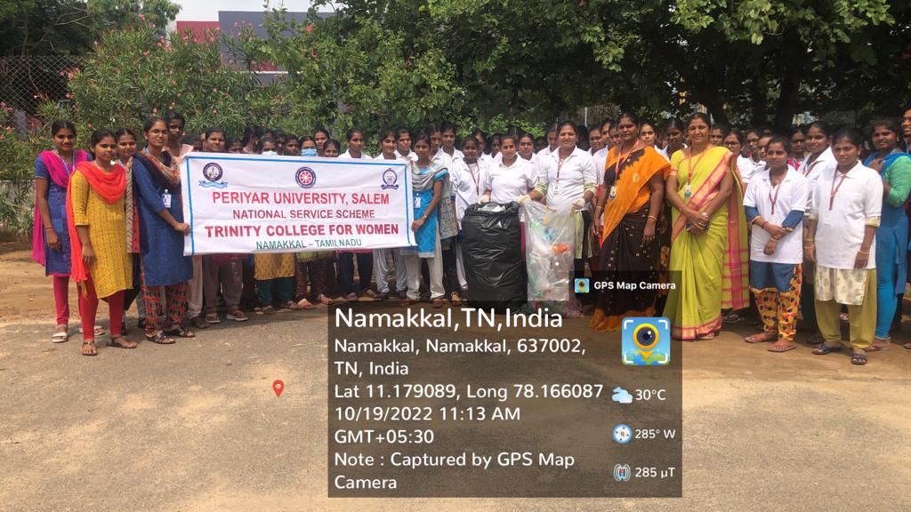 The National Service Scheme wing of Trinity College for Women, Namakkal organized “Clean India Campaign” (Massive Cleaning Campaign and Plastic Waste Collection) on 19th October 2022. The volunteers of NSS collected 69 kg plastic waste and they removed it from the College and public places in and around Maharishi Nagar and Mahalakshmi Nagar in Vagurampatti village, Namakkal District.