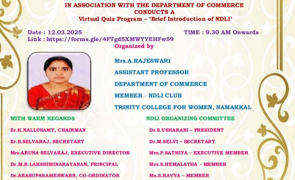 The NDLI club, in association with the department of commerce, Trinity College for Women, Namakkal conducted a virtual quiz programme titled “Brief introduction of NDLI” on 12.03.2025. It was held through the virtual mode of google meet. Mrs. A. Rajeswari, Assistant Professor in Commerce & Member – NDLI Club, Trinity College for Women, Namakkal was the coordinator of the programme.