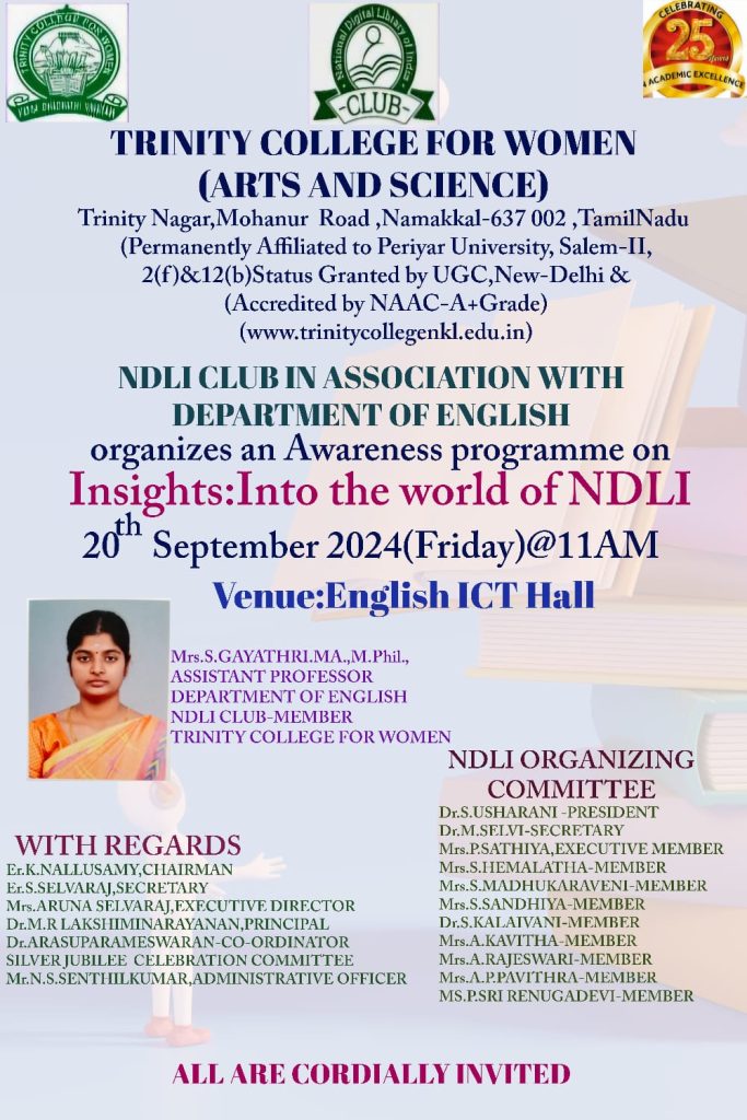 The NDLI Club, in association with the department of English, Trinity College for Women, Namakkal conducted an awareness programme entitled “Insights: into the world of NDLI” on 20.09.2024. Mrs. S. Gayathri, Assistant Professor in English, Trinity College for Women, Namakkal was the resource person. She explained the details, resources, various formats of the contents, searching filters, how many languages covers and method of search and retrieved the documents from the NDLI portal. All the students of English participated in that programme.