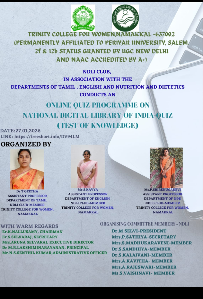 The NDLI Club, in association with the department of Tamil, English and Nutrition & Dietetics, Trinity College for Women, Namakkal, conducted an online quiz programme titled “National Digital Library of India – Quiz” (Test of Knowledge) on 27th January 2026.