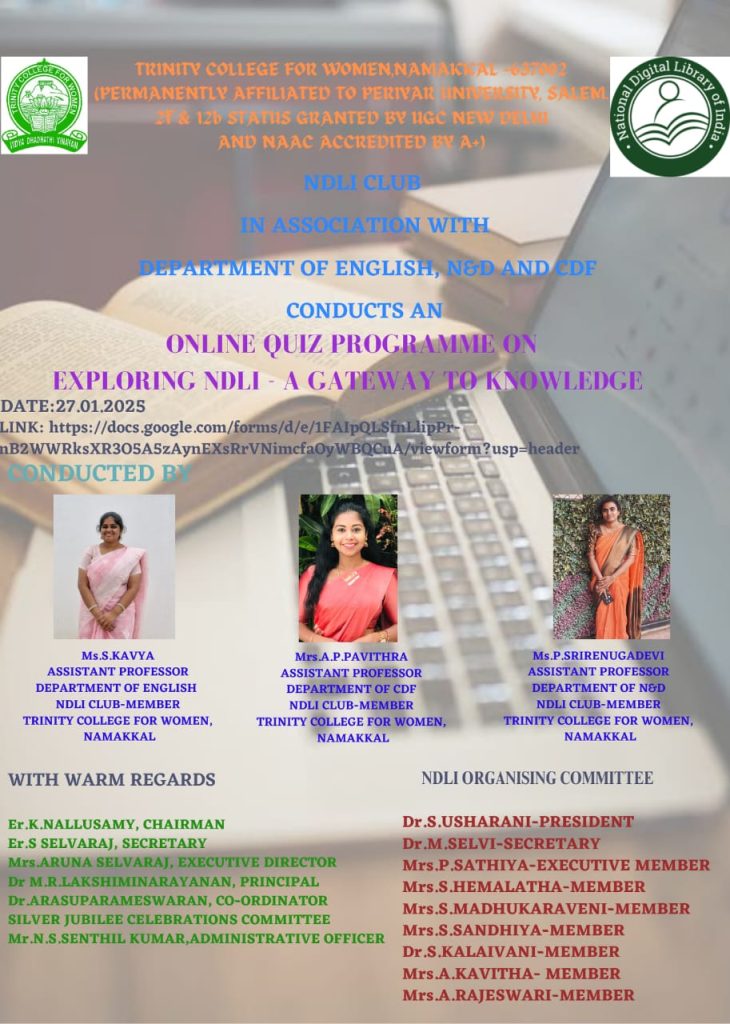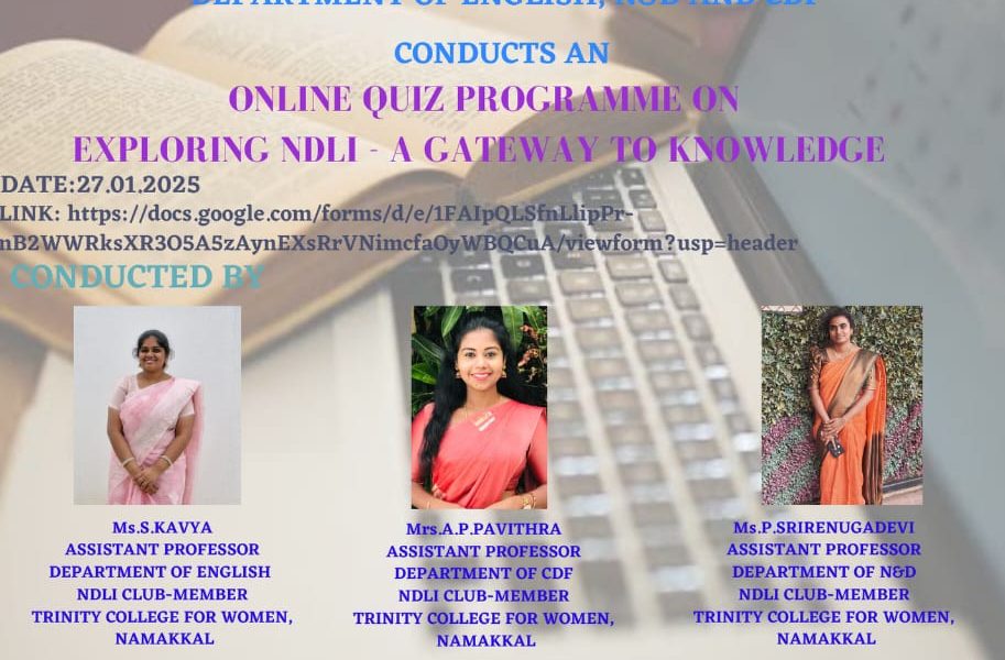 The NDLI Club, in association with the departments of English, Costume Design & Fashion and Nutrition & Dietetics, Trinity College for Women, Namakkal, conducted a one day online quiz programme titled “Exploring, NDLI – A Gateway to knowledge” on 27th January 2025.