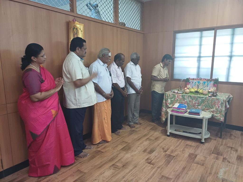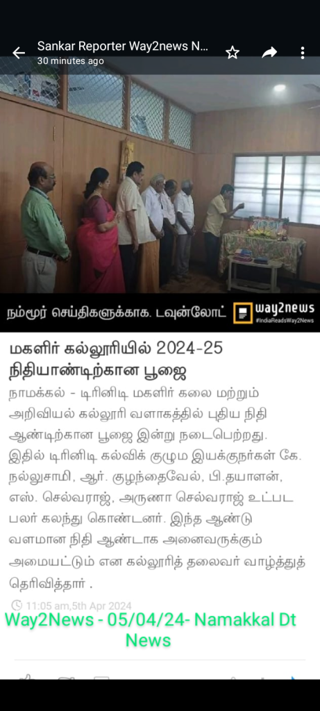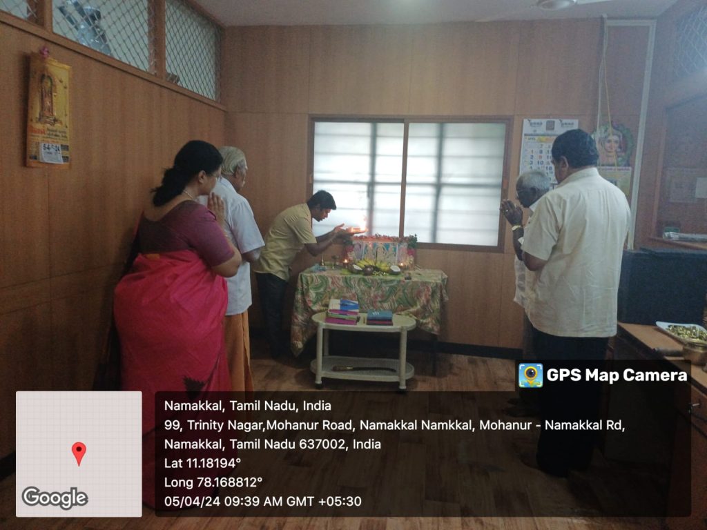 The New Accounting Year (2024-2025) Pooja was held on the campus of Trinity College for Women, Namakkal, on April 5, 2024. Dr. R. Kulandaivel, President of Trinity Academy Matric Higher Secondary School, Er. K. Nallusamy, Chairman, Trinity College for Women, Mr. P. Dhayalan, Transport Director, Trinity Academy Matric Higher Secondary School, Er. S. Selvaraj, Secretary; and Mrs. Aruna Selvaraj, Executive Director; Dr. M.R. Lakshiminarayanan, Principal; and Dr. Arasuparameswaran, Director, – Academic of the College took part in that pooja.