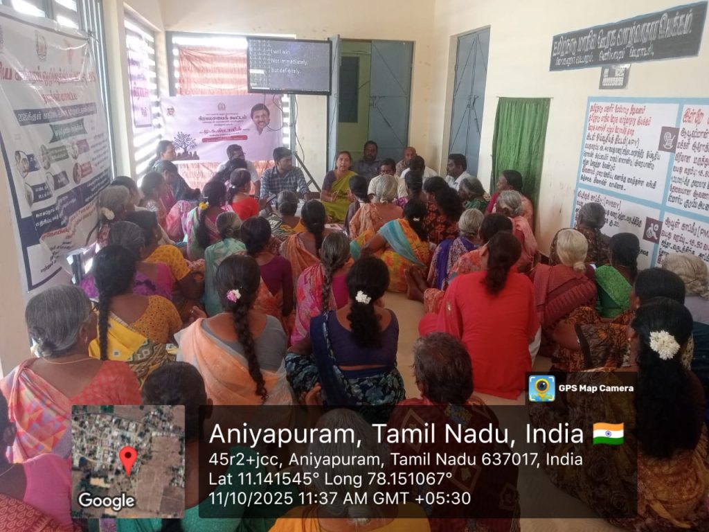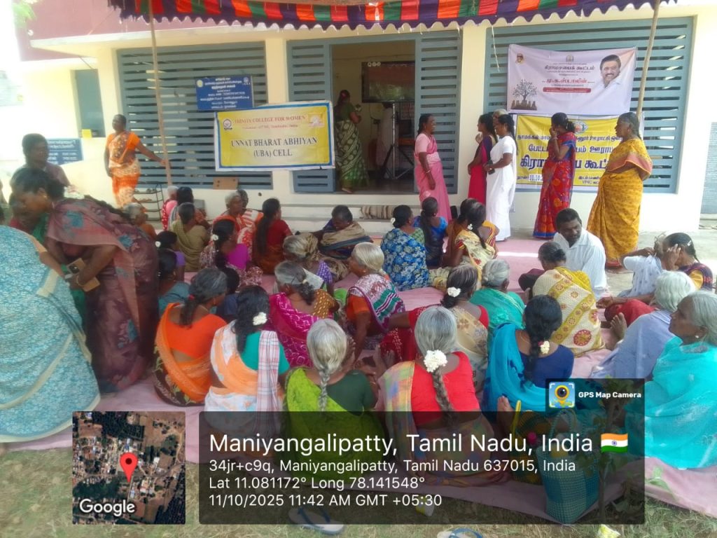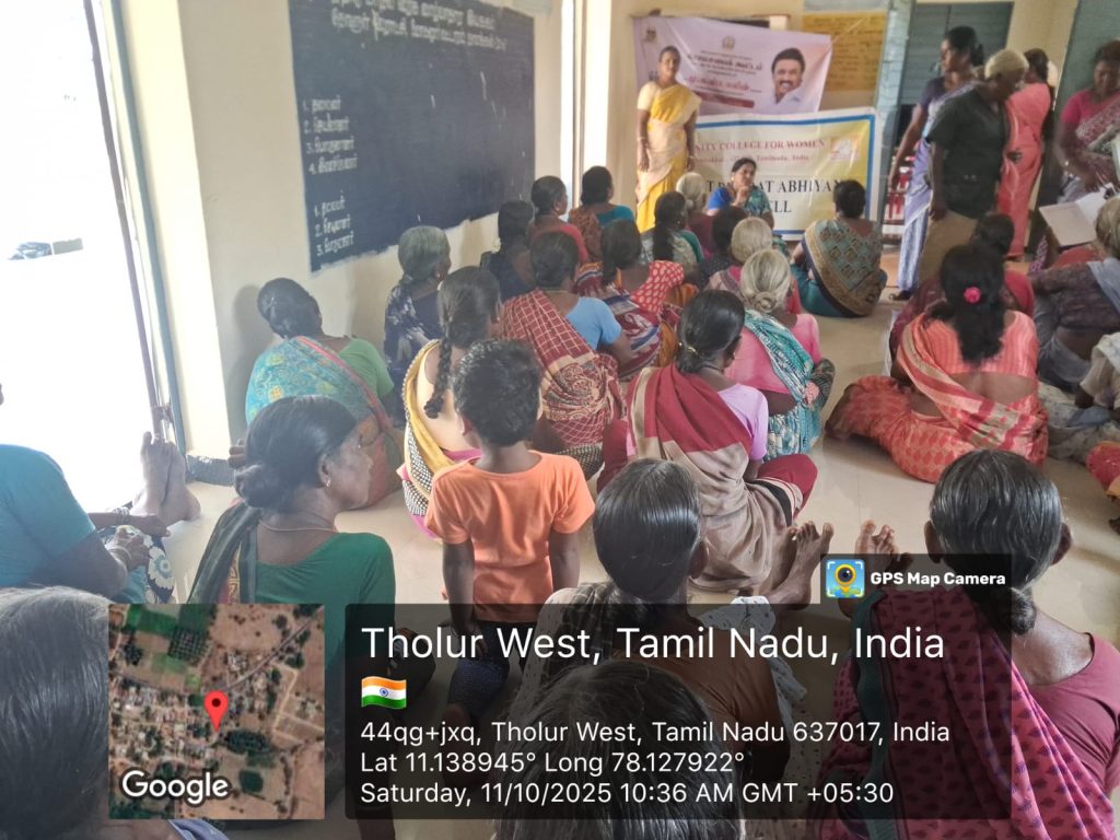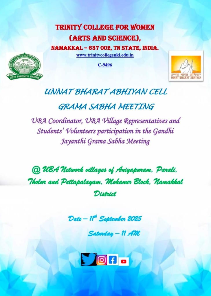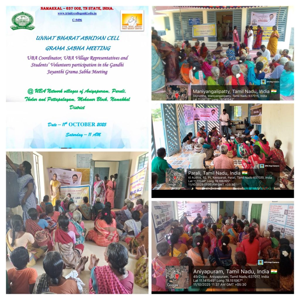 The nominated students, as well as UBA network villages (Aniyapuram, Parali, Tholur and Pettapalayam, Mohanur Taluk, Namakkal District) faculty representatives of Trinity College for Women, Namakkal (C9496) participated in the Gandhi Jayanthi Grama Sabha Meet held on 11th October 2025