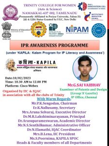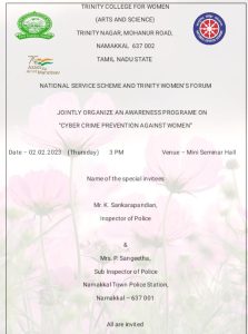 The NSS Cell & Trinity Women’s Forum of Trinity College for Women in association with Namakkal District Police organized an awareness Programme entitled “Cybercrime prevention against women” on 02.02.2023. It was held in the premises of a mini seminar hall.