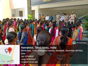 All the NSS volunteers took a pledge against drug abusement. This programme was organized by the Department of Police, Namakkal District and The National Service Scheme of Trinity College for Women, Namakkal.