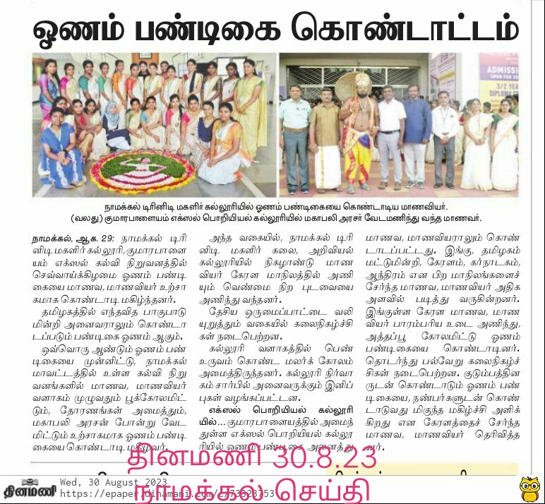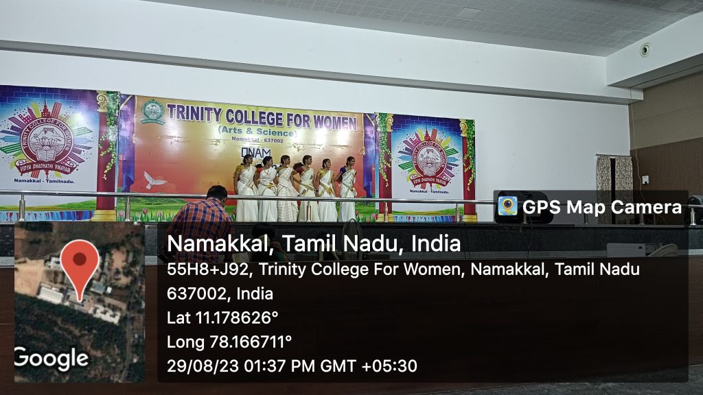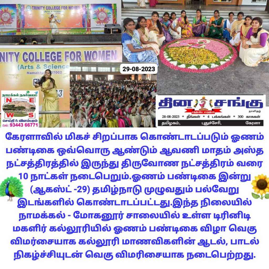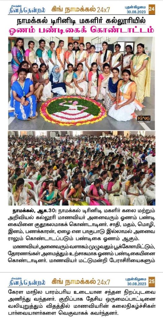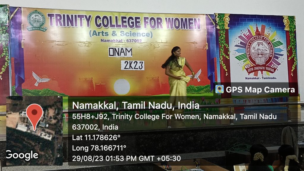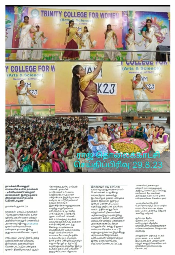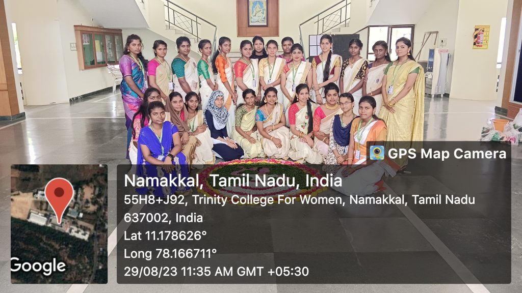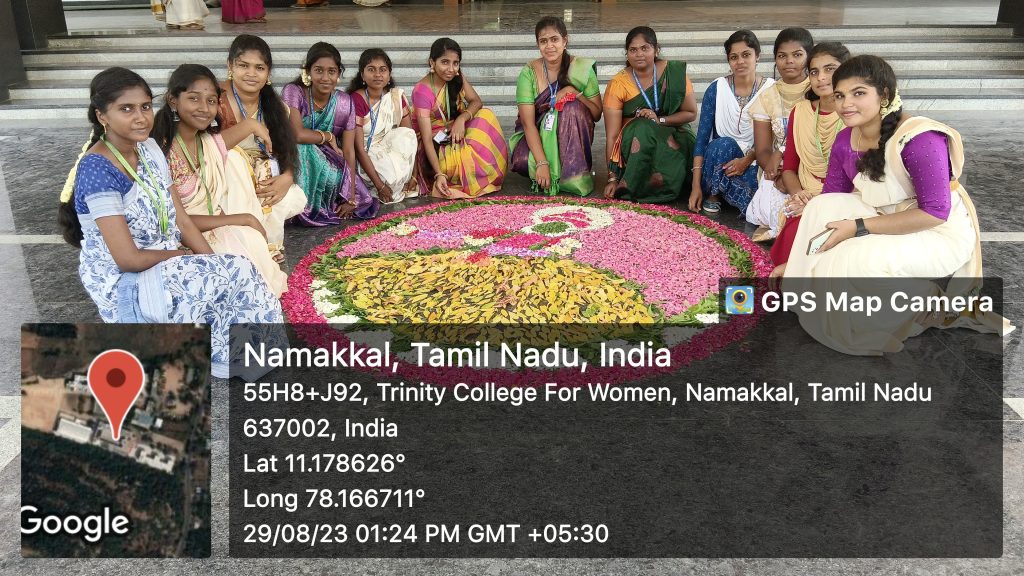The Onam festival was celebrated with great enthusiasm at Trinity College for Women, Namakkal, on September 29, 2023. All the students celebrated happily and enthusiastically participated in games and cultural programs.