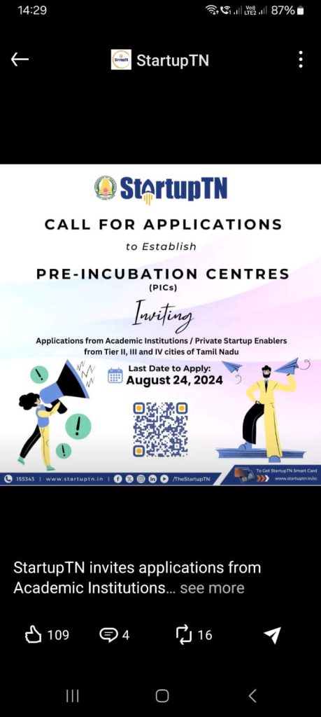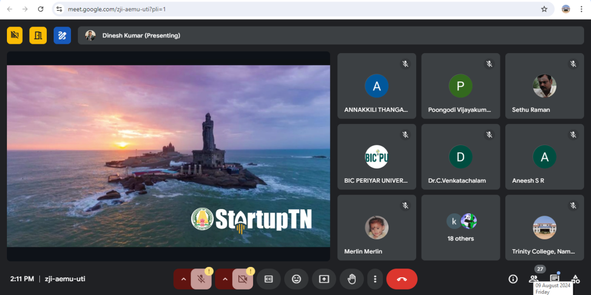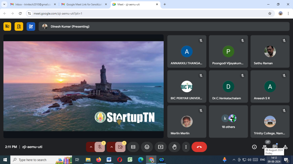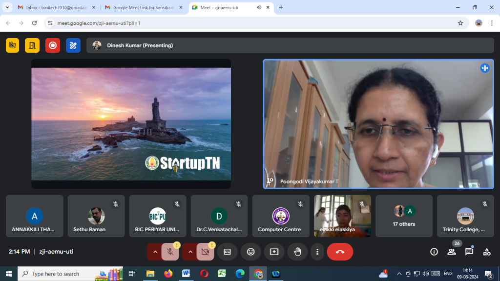 The Periyar University Business Incubation Confederation, Periyar University, Salem conducted an online event titled “Sensitisation Programme on the establishment of Pre-incubation centre (PIC’s) in higher educational Institutions on 09th August 2024 from 2 PM to 4 PM. It was held through the virtual platform of “Google Meet,