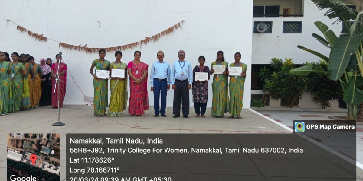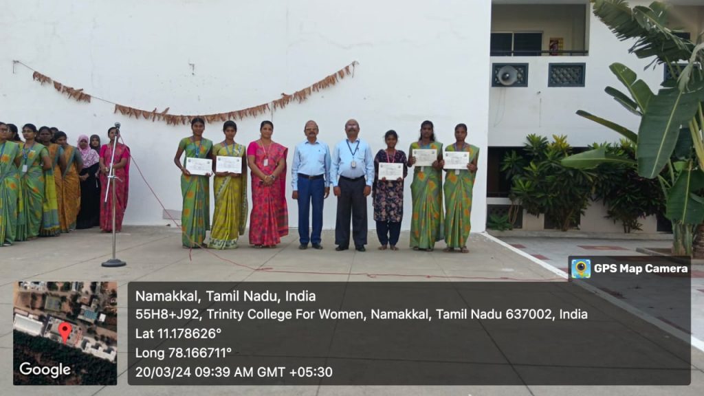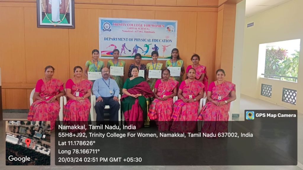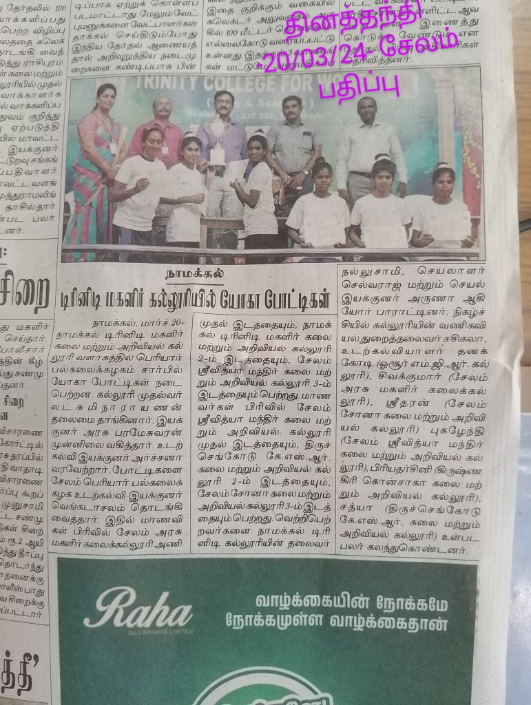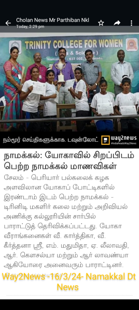 The Periyar University Yoga Tournament (for the academic year 2023-2024) was held on 15.03.2024 on the campus of Trinity College for Women, Namakkal. Many Arts and Science colleges in and around Periyar University region (Salem, Namakkal, Dharmapuri and Krishnagiri) took part. Our Trinity College for Women, Namakkal got the overall second position (Runner) in the women’s yoga tournament.