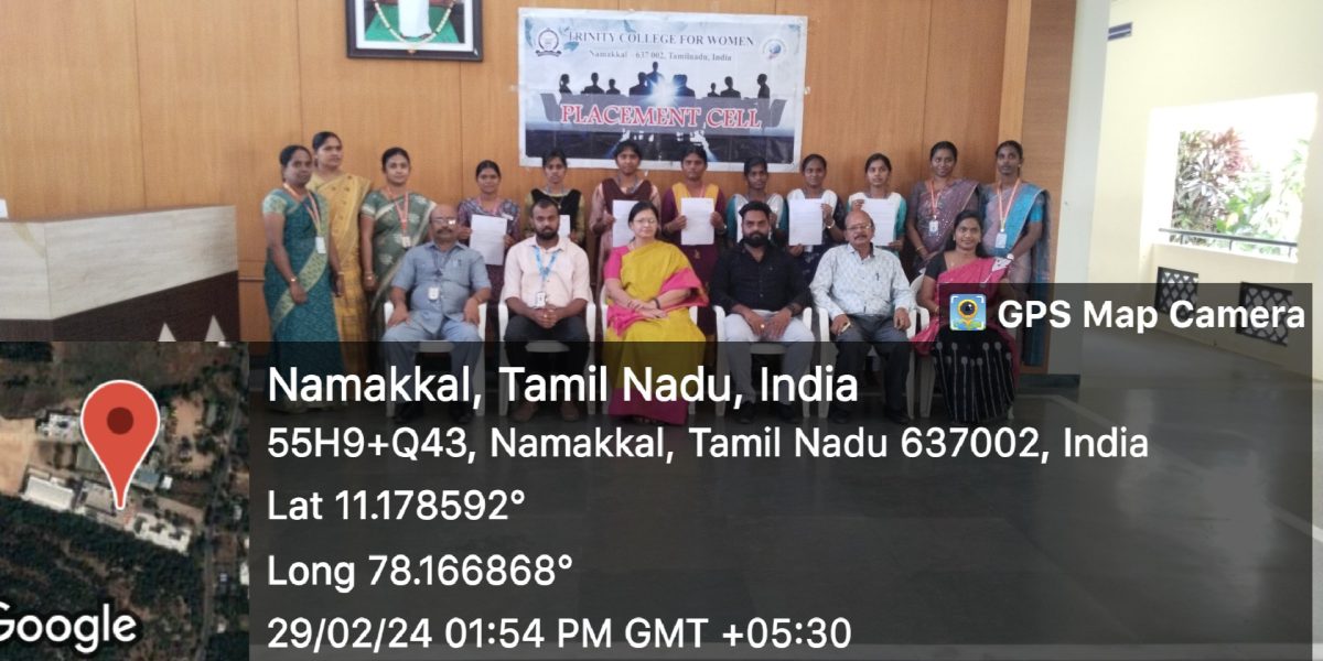 Dr. B. Lakshmi, Assistant Professor and Head, Department of Physics and Coordinator of Placement Officer, and the members of the Placement Cell, Mrs. S. Hemalatha (Tamil), Mrs. P. Abirami (English), Dr. S. Revathy (Mathematics), Mrs. K. Saranya (Physics), Dr. S. Kalaivani (Chemistry), Mrs. V. Abirami (Computer Science), and Mrs. Rajeswari (Commerce), made arrangements. All the below said selected students are greeted by Er. K. Nallusamy, Chairman, Er. S. Selvaraj, Secretary, Mrs. Aruna Selvaraj, Executive Director, Dr. M.R. Lakshiminarayanan, Principal, Dr. Arasuparameswaran, Director – Academic and Mr. N.S. Senthilkumar, Administrative Officer, Trinity College for Women, Namakkal.