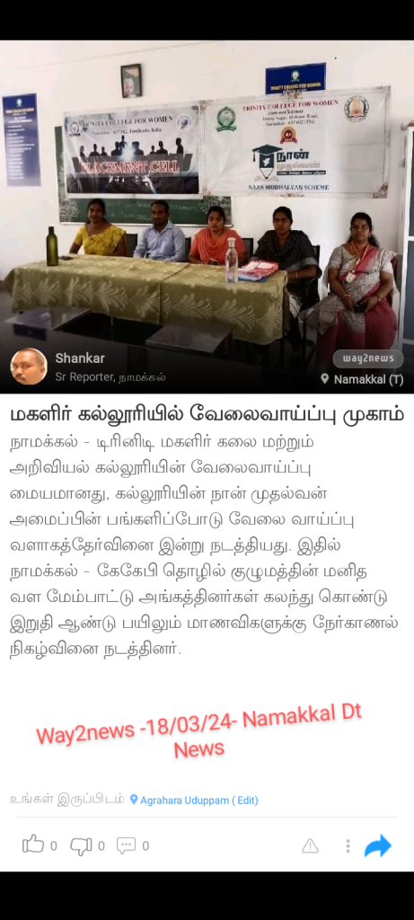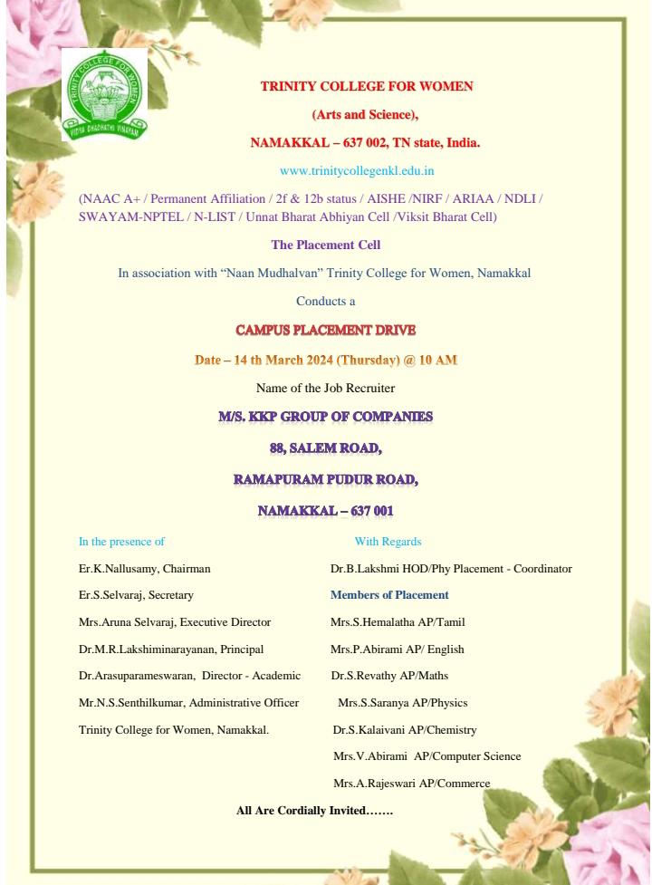 The Placement Cell, in association with the Naan Mudhalvan, Trinity College for Women, Namakkal, conducted a campus placement drive on March 14, 2024, on the college campus. Mr. R. Muniyasamy, CFO; Mr. V. Vengatesh, HR Manager; Mrs. S. Malathi, Personal Officer; and Mrs. S. Sundari, Welfare Officer, M/s. KKP Group of Companies, 88, Salem Road, Ramapuram Pudur Road, Namakkal. The following 46 students from our college have been selected for the first phase of this placement drive: