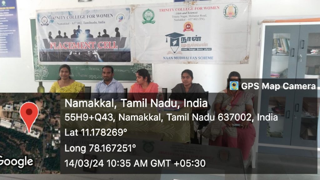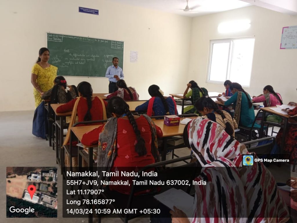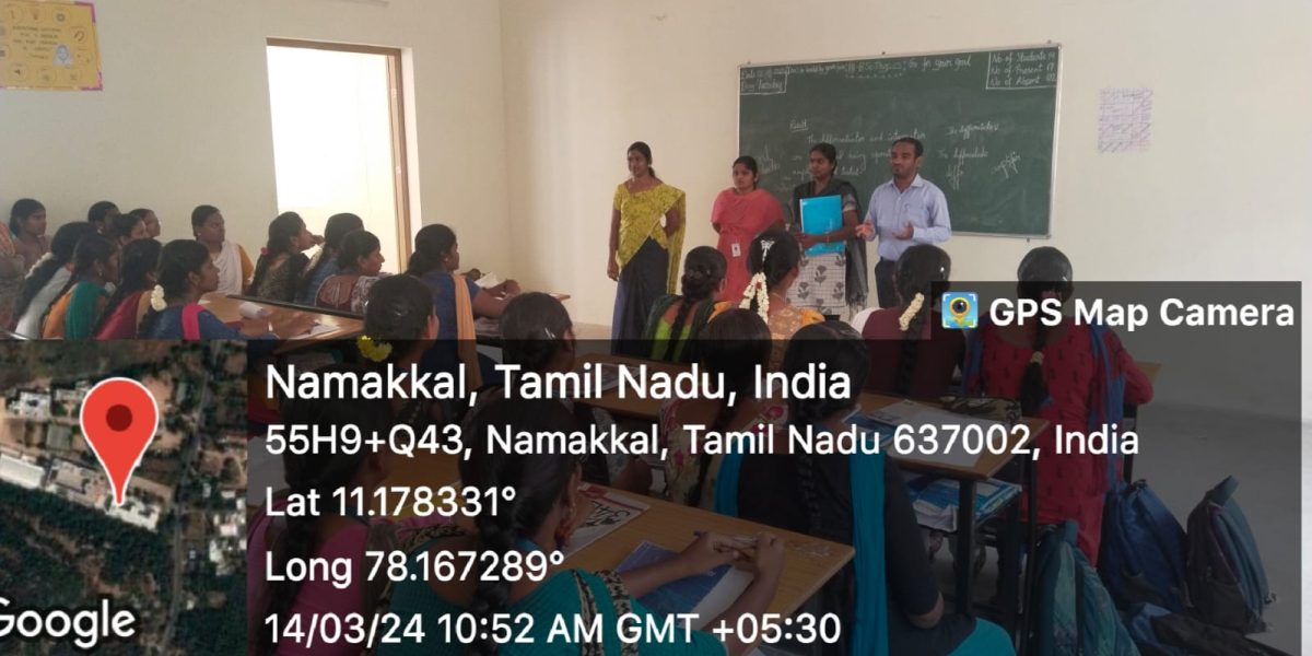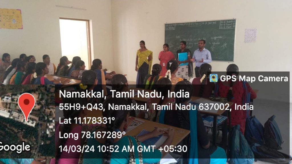 All the participants are greeted by Er. K. Nallusamy, Chairman, Er. S. Selvaraj, Secretary, Mrs. Aruna Selvaraj, Executive Director, Dr. M.R. Lakshiminarayanan, Principal, Dr. Arasuparameswaran, Director – Academic, Mr. N.S. Senthilkumar, Administrative Officer, Dr. B. Vishnupriya, Coordinator – Naan Mudhalvan, Dr. B. Lakshmi, Placement Officer, the members of placement cell Mrs. S. Hemalatha (Tamil), Mrs. P. Abirami (English), Dr. S. Revathy (Mathematics), Mrs. K. Saranya (Physics), Dr. S. Kalaivani (Chemistry), Mrs. V. Abirami (Computer Science), and Mrs. Rajeswari (Commerce), made arrangements.