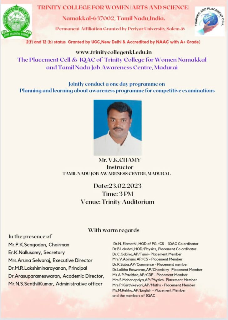 The Placement Cell & Internal Quality Assurance Cell of Trinity College for Women, Namakkal and Tamil Nadu Job Awareness Centre, Madurai jointly organized a career guidance programme in the title of “Planning and learning about awareness programme for competitive examinations” on 23rd February 2023 (Thursday) in our College campus.   Mr. V.K. Chamy, Instructor, Tamil Nadu Job Awareness Centre, Madurai was the resource person.    He gave various guidelines like notification of examinations date, nature of examinations, eligibility criteria, read out of good study materials, preparation for the aptitude tests, continuous revision & practice,  make notes from the newspapers, journals, magazines, websites, positive approach, etc., related to appearing in the competitive examinations.   Dr. B. Lakshmi, Placement Officer  and the members of Placement Cell Dr C Gobiya, Mrs. V. Abirami, Dr. R. Suba, Dr. Lalitha Easwaran, Mrs. A.P. Pavithra, Mrs. S. Mohanapriya, Mrs. P. Karthikeyani and Ms. M. Rekha made arrangements.