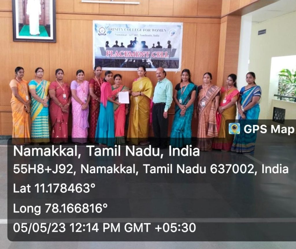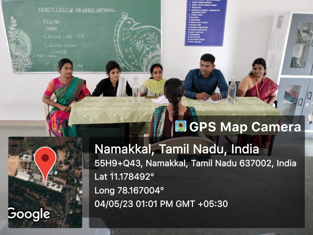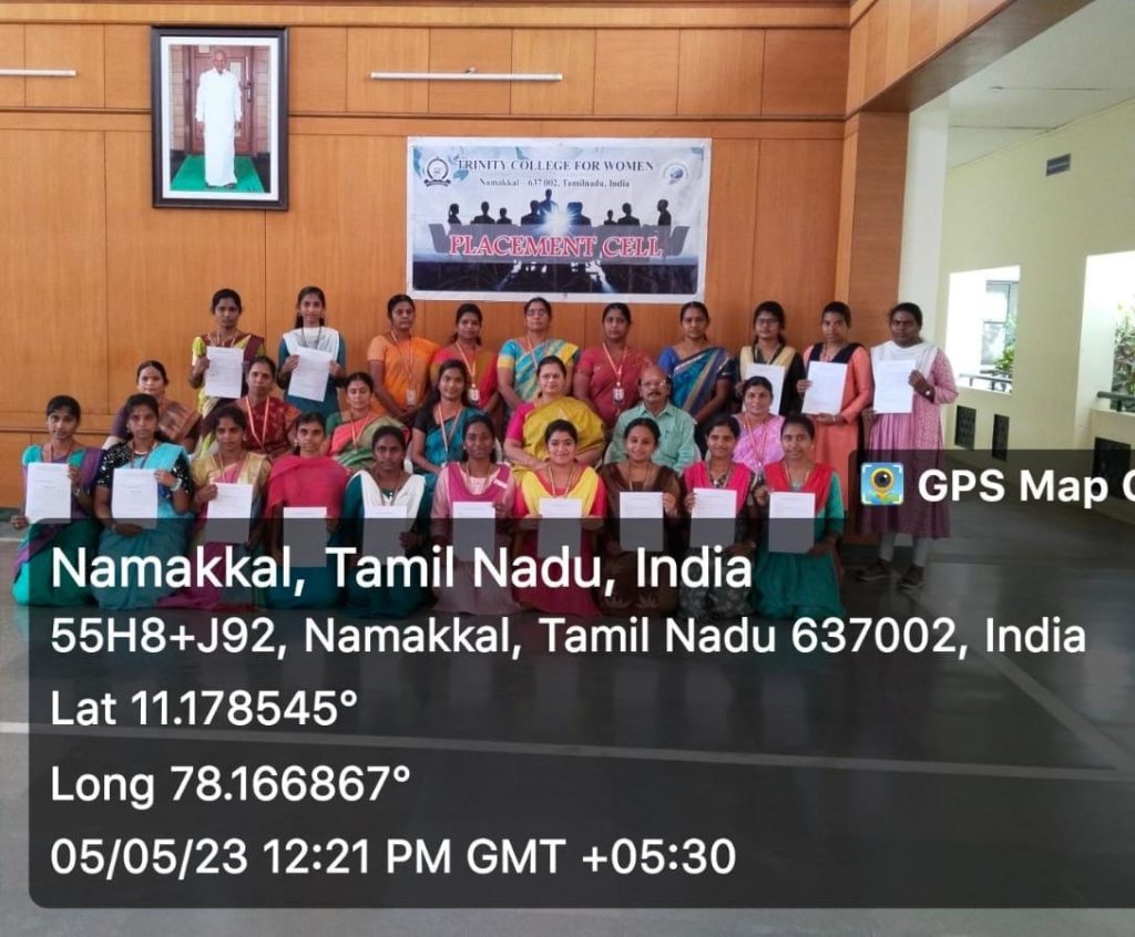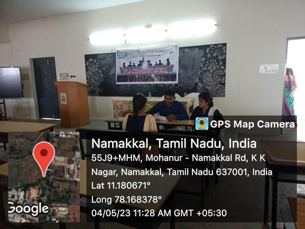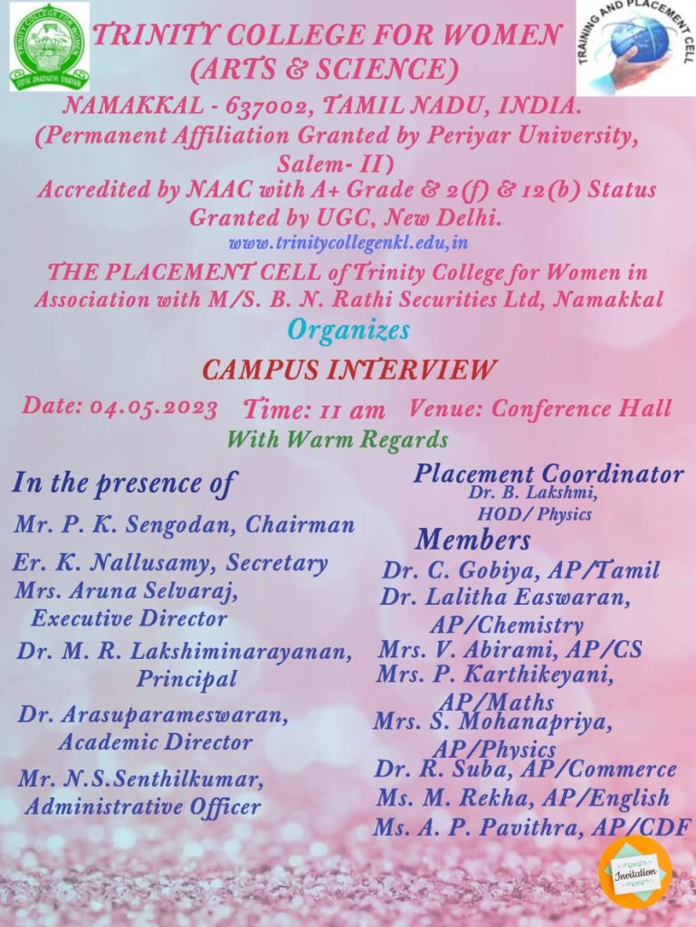 The Placement Cell of Trinity College for Women in association with M/s. B.N. Rathi Securities Ltd, Namakkal conducted a campus Interview on 04.05.2023 (Thursday) @ 11 AM on our college campus. In this regard, nearly 200 final year students from both UG and PG took part. Mr. R. Balakumar, Vice President of South Head, Ms. G. Devishri, Team Leader and Ms. D. Thamayanthi, Team Leader, M/s. B.N. Rathi Securities Ltd., Namakkal and his subordinates of the concern were the special invitees. They selected the students through the written test, group discussion and personal interview. Nearly 100 final year post-graduate students actively participated.