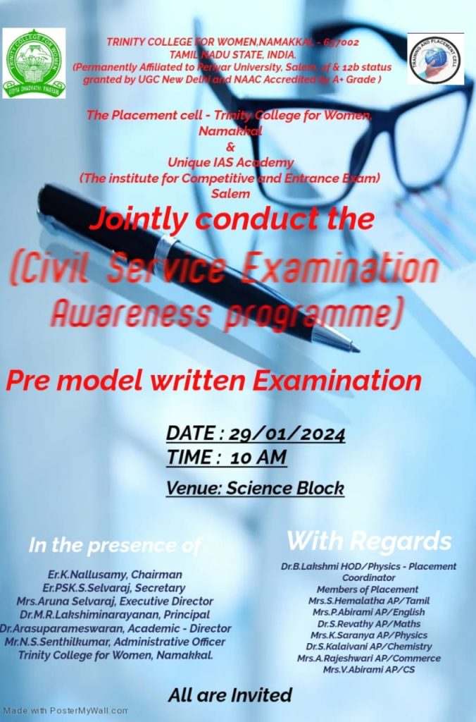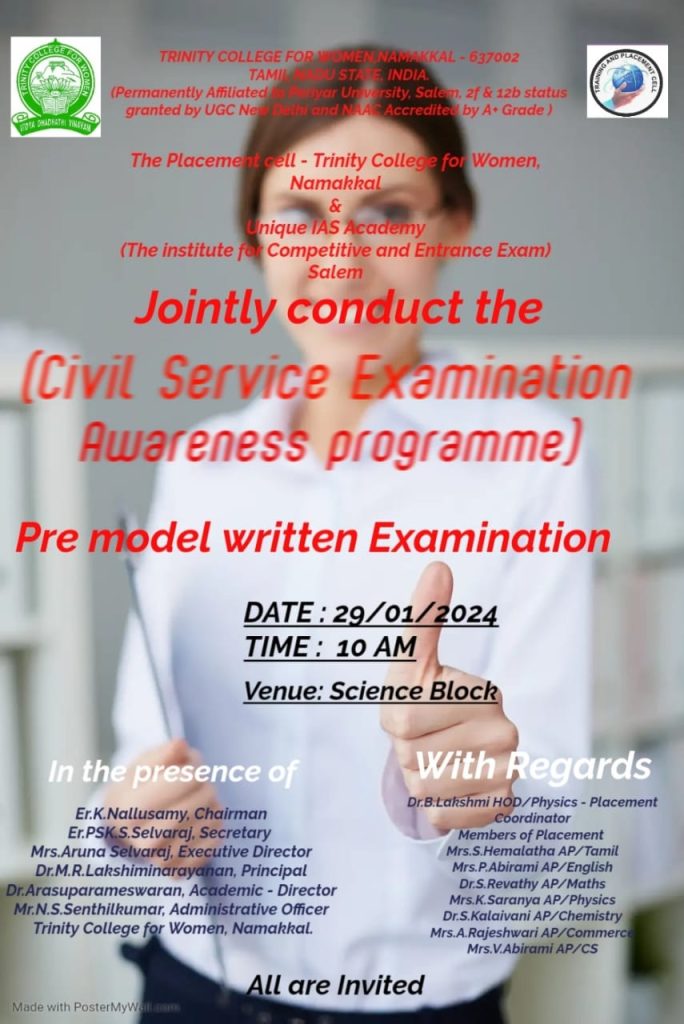 Each and every youngster of the current generation has to crack the civil service examinations like IAS, IPS, and IFS. On this subject, The Placement Cell of Trinity College for Women, Namakkal, and M/s. Unique IAS Academy (The Institute for Competitive and Entrance Examinations), Salem jointly conducted the program entitled “Civil Services Awareness Programme—Pre Model Written Examination” on January 29, 2024, on the college campus.