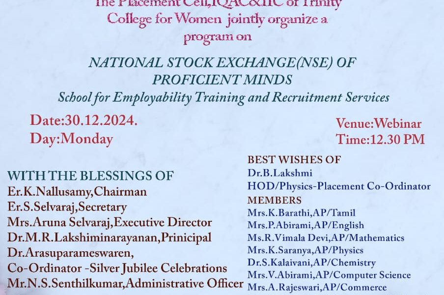 The Placement Cell, The Internal Quality Assurance Cell and Institutions Innovation Council, Trinity College for Women, Namakkal conducted an online programme titled “National Stock Exchange (NSE) of Proficient Minds” (School for Employment Training and Recruitment Service) on 30th December 2024.