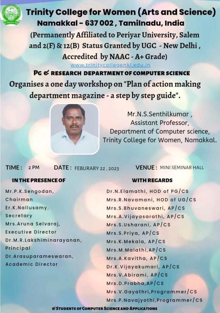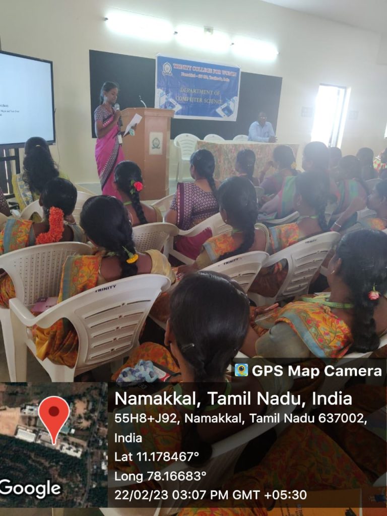 The Post Graduate and Research Department of Computer Science, Trinity College for Women, Namakkal organized a one day workshop entitled “Plan of action making department magazine – a step by step guide” on 22.02.2023 in the College mini seminar hall. Mr. N.S. Senthilkumar, Assistant Professor in Computer Science, Trinity College for Women, Namakkal was the resource person. He described the various contents of department magazines, journals like presentation of abstract, key words, articles, map, diagram, numerical data, photographs, usage of text format, font size, page size and secondary resources. Apart from that, he explained the differentiation between magazines and journals. More than 250 students took part.
