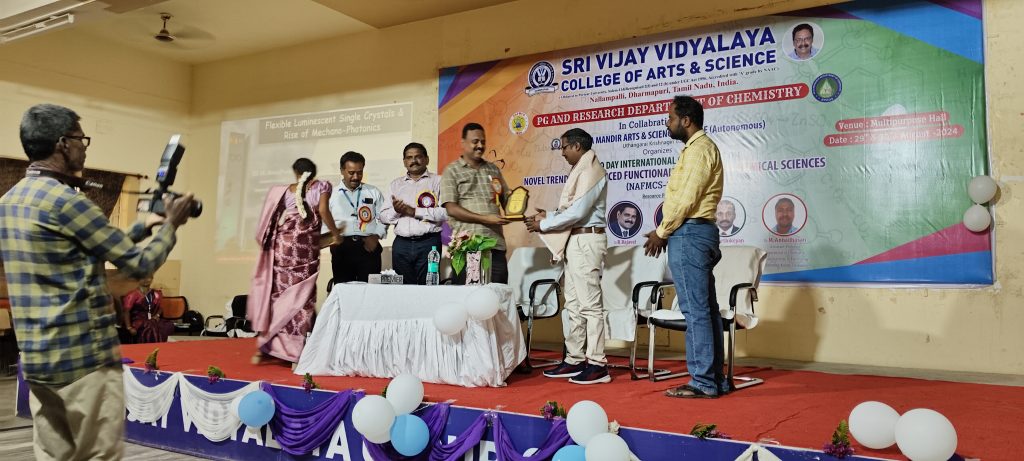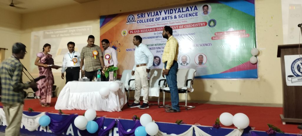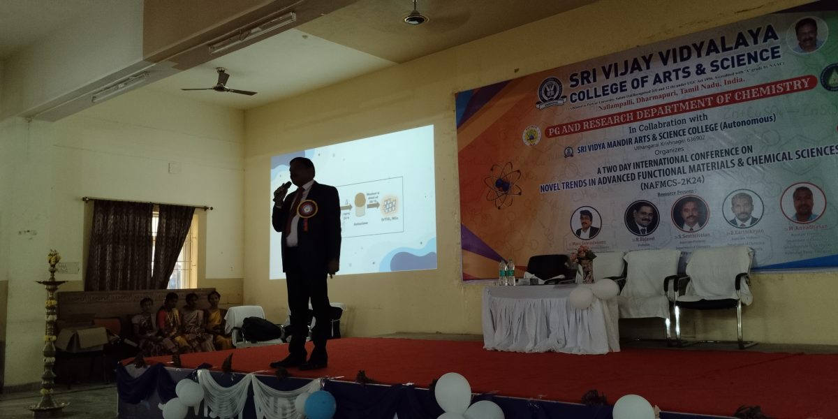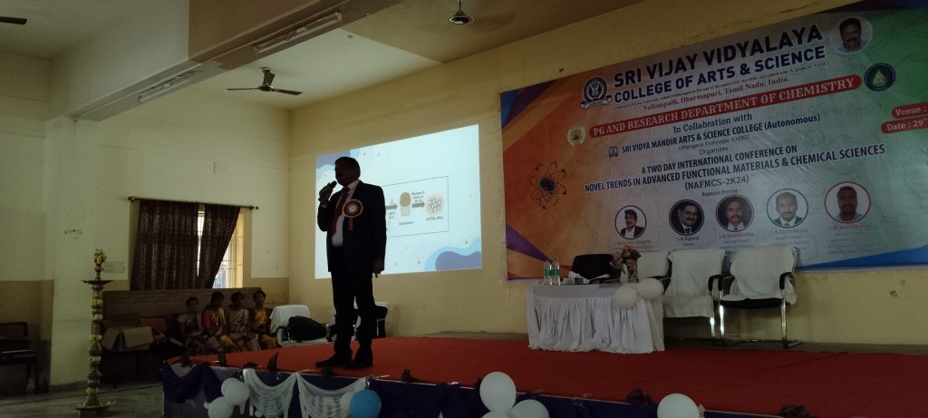 The postgraduate and research department of Chemistry, Sri Vijay Vidyalaya College of Arts and Science, Nallampalli, Dharmapuri District organized a two-day international level conference titled “Novel trends in advanced functional materials and chemical sciences (NAFMCAS-2K24) on 29th and 30th August 2024 in the College campus. The various topics like biosensors, biomaterials, bio-organic chemistry, catalysis, coordination chemistry, crystal growth, green chemistry, environmental chemistry, electro analytical chemistry, advanced material science, nano science and nanotechnology, semiconductors and optoelectronic crystals, organometallic chemistry, ceramic additive manufacturing, phytochemistry, polymer chemistry, renewable energy sources, supramolecular chemistry, materials for energy and environment and thin film materials.
