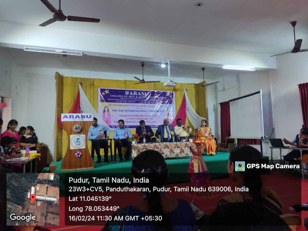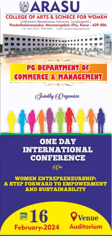 The postgraduate and research department of Commerce, Arasu College of Arts and Science, Panduthakaranpudur, Manmangalam Taluk, Karur District, conducted a one-day international conference entitled “Women Entrepreneurship: A Step Forward to Empowerment and Sustainability” on February 16, 2024, on the college campus. The various themes like startup funding strategies, innovation and creativity in entrepreneurship, entrepreneurial ecosystems, social entrepreneurships, technology and entrepreneurships, women in entrepreneurships, global entrepreneurships, entrepreneurial failure and resilience, corporate entrepreneurships (Intrapreneurship), E-commerce and entrepreneurship, entrepreneurial leadership, ethics in entrepreneurship, entrepreneurial marketing strategies, family business entrepreneurship, agile entrepreneurship, entrepreneurial education and training, legal and regulatory challenges in entrepreneurship, health and wellness entrepreneurship, block chain and crypto currency entrepreneurship, etc., were discussed in that conference.
