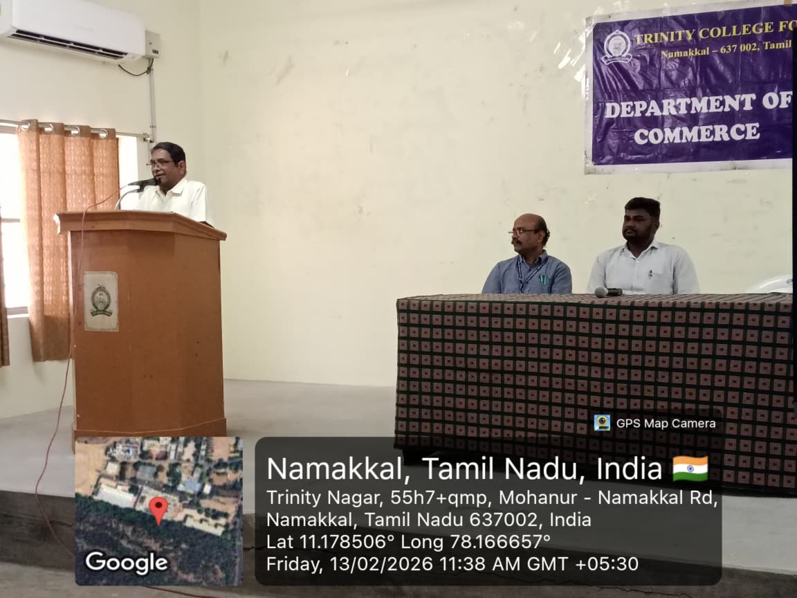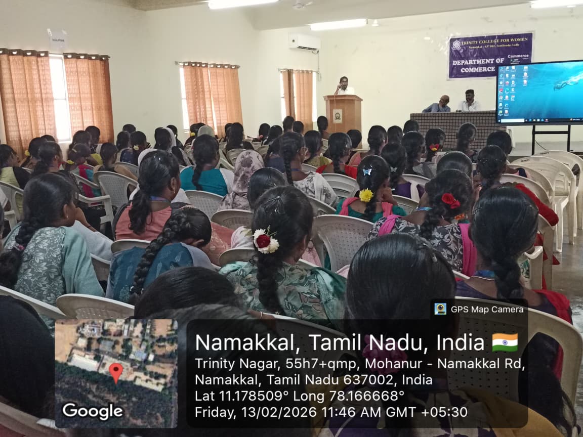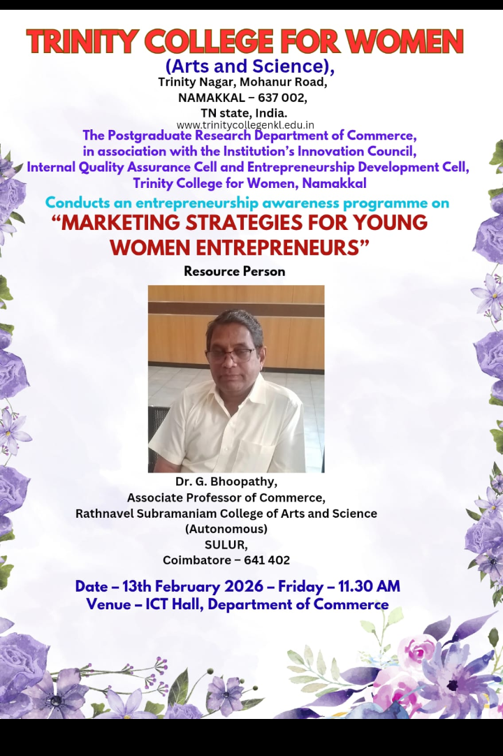 The Postgraduate and Research Department of Commerce, in association with the Institution’s Innovation Council, Internal Quality Assurance Cell and Entrepreneurship Development Cell, Trinity College for Women, Namakkal, organized an entrepreneurial awareness programme titled “Marketing Strategies for Young Women Entrepreneurs” on 13.02.2026 in the College premises. The main objective of the programme was to equip participants with essential skills in market analysis, branding, digital marketing and customer relationship management.