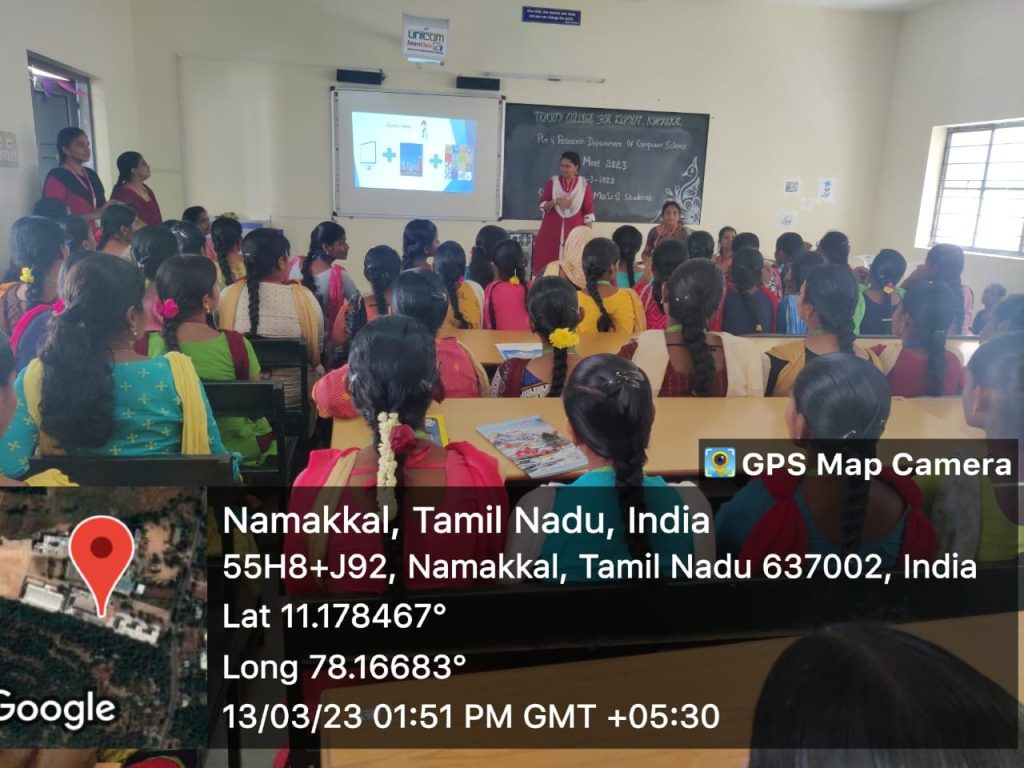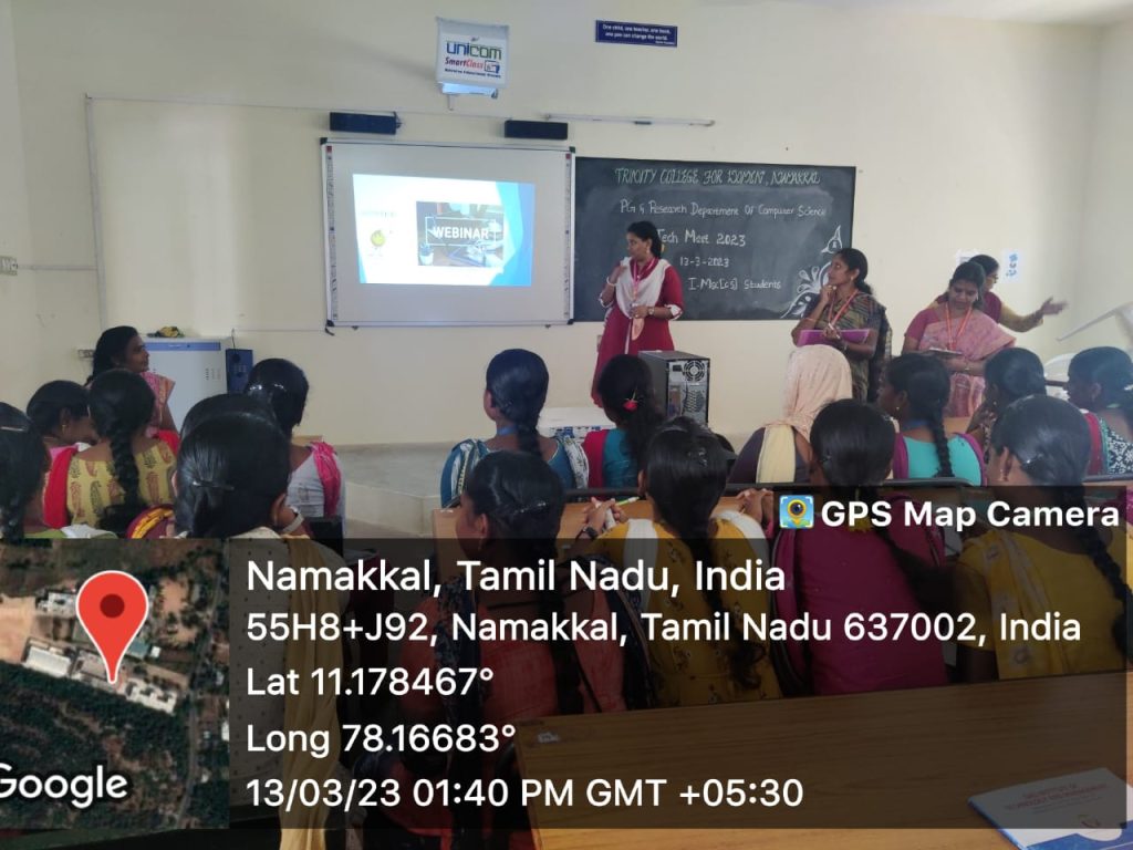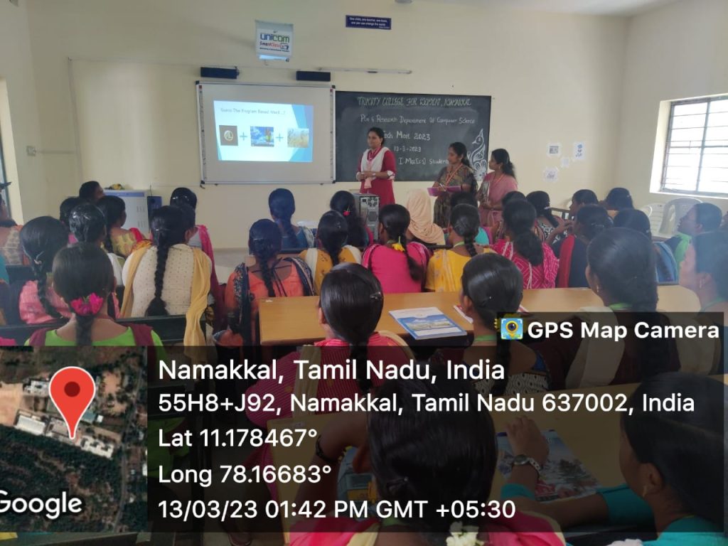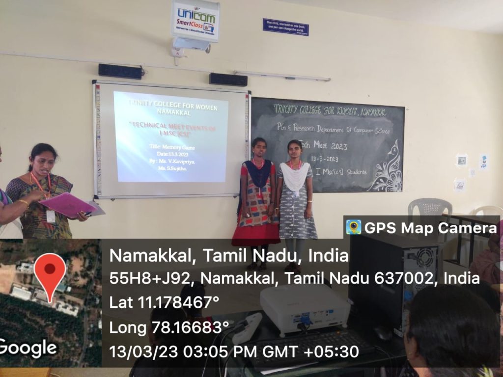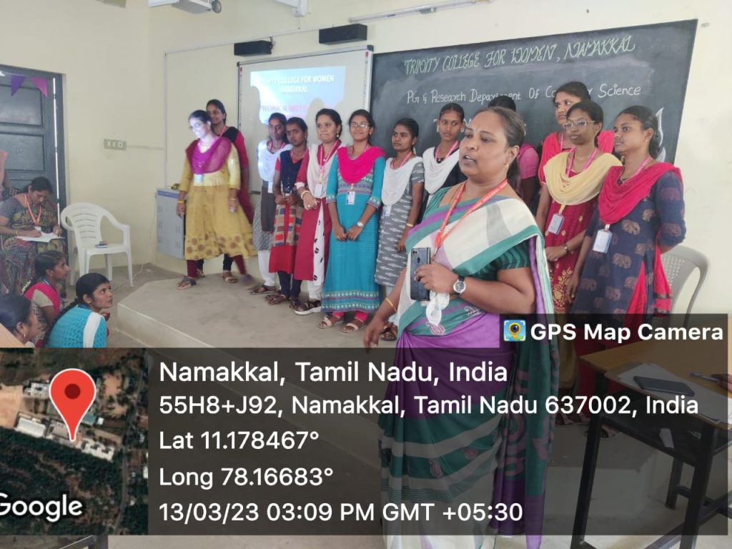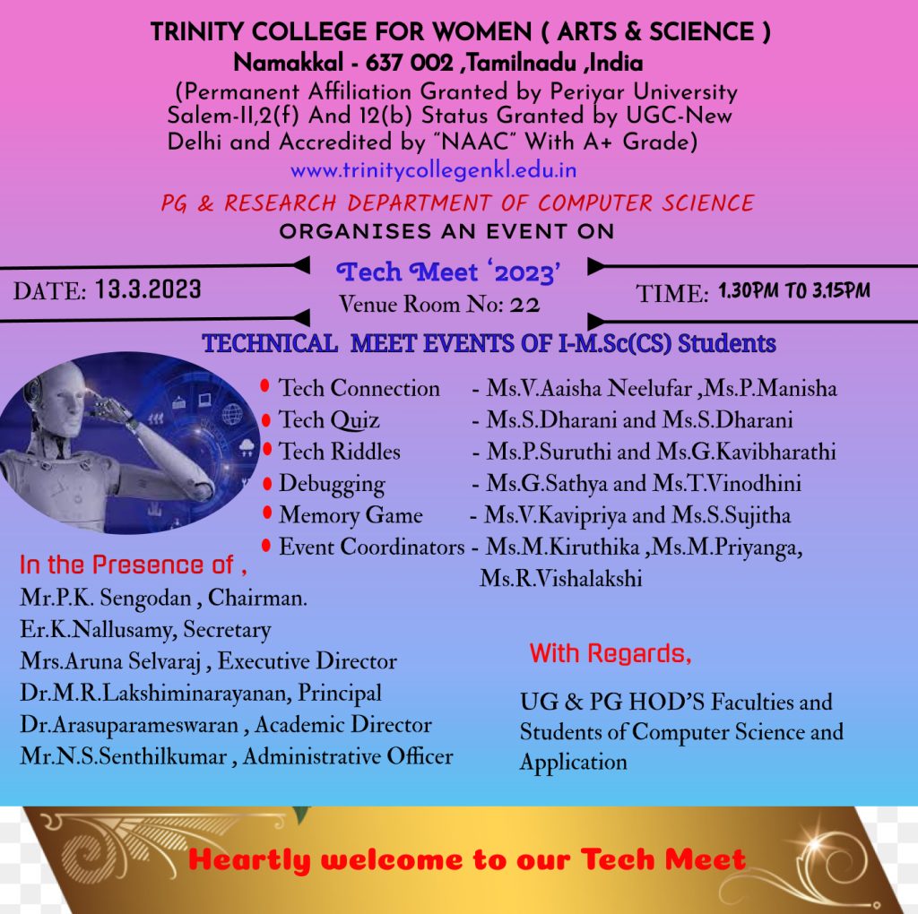 The Postgraduate and Research department of Computer Science, Trinity College for Women, Namakkal conducted a one day event entitled “Tech Meet 2023” – Technical Meet events for the benefit of first year students of M.Sc., Computer Science on 13th March 2023.