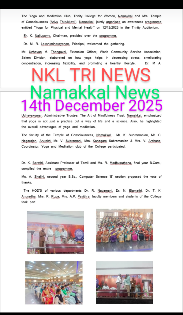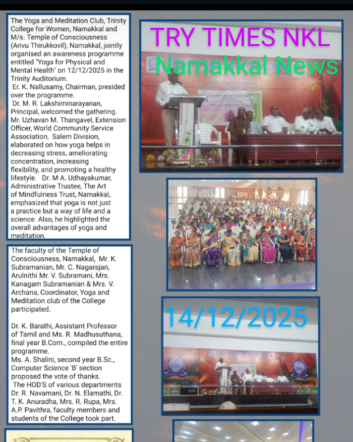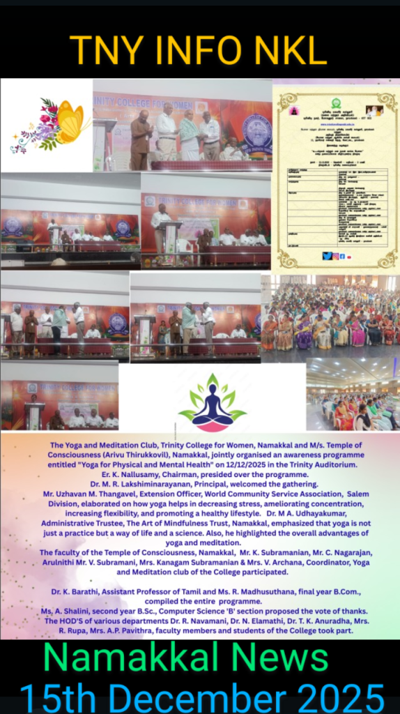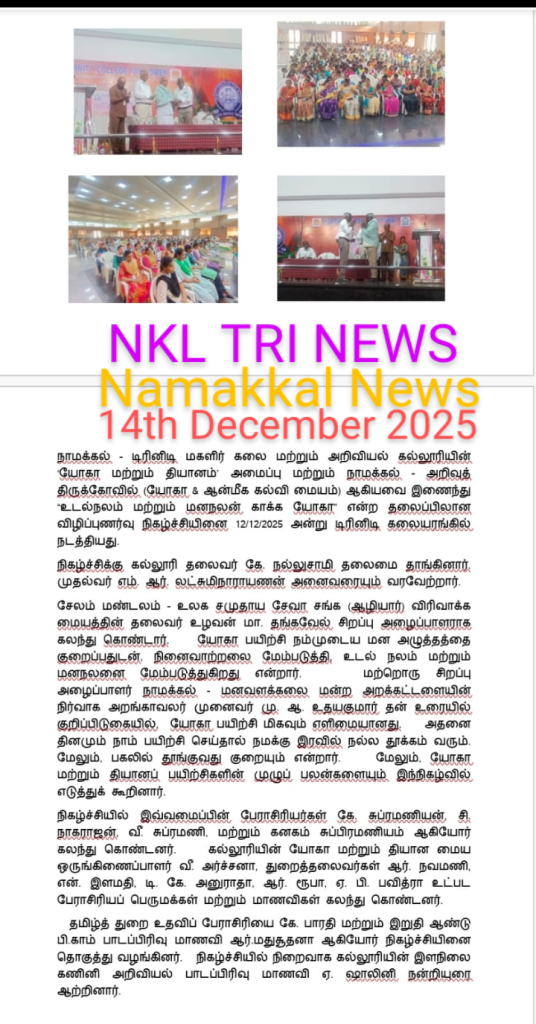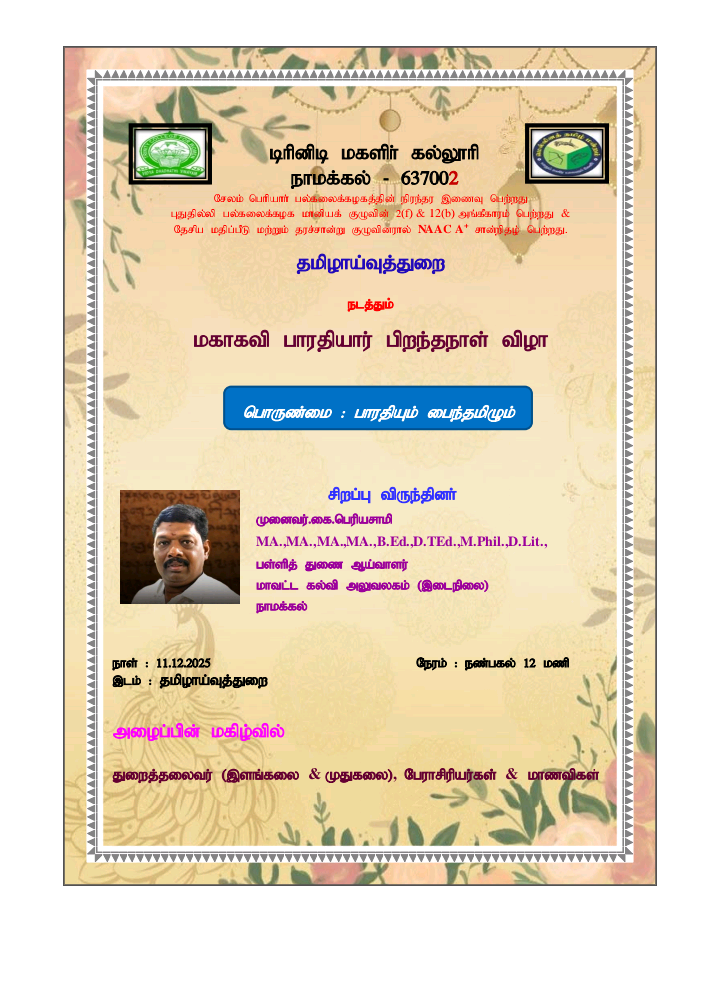 The Postgraduate and Research Department of Tamil, Trinity College for Women, Namakkal, celebrated the eminent Tamil poet Mahakavi Subramaniya Bharathiyar’s 144th birth anniversary on 11th December 2025 in the College premises.