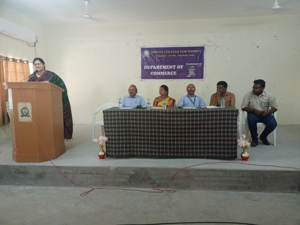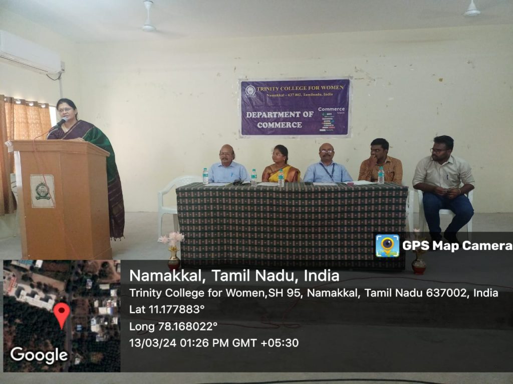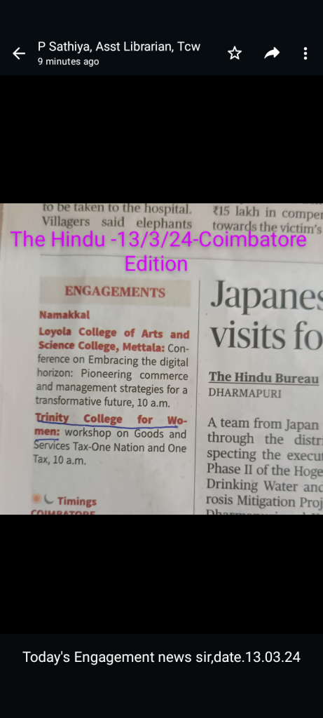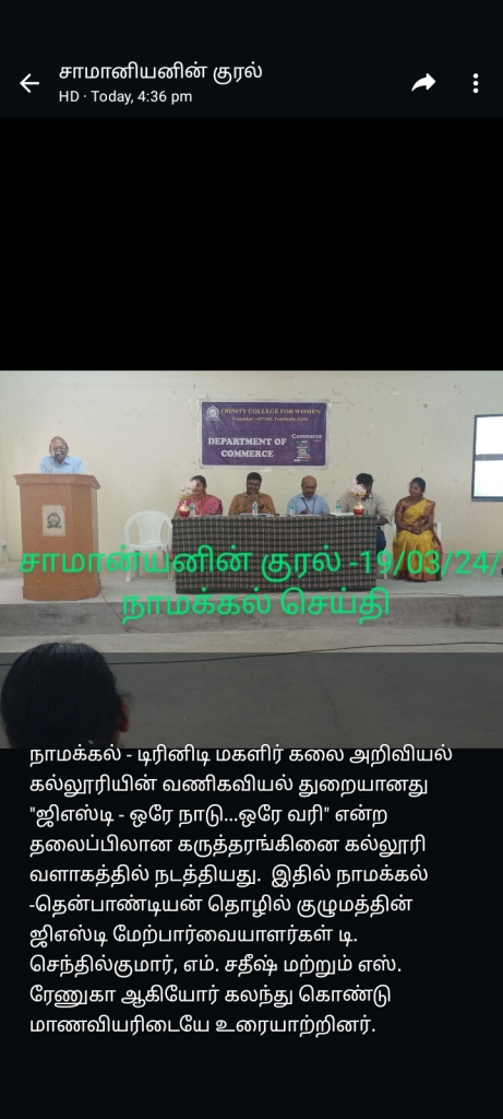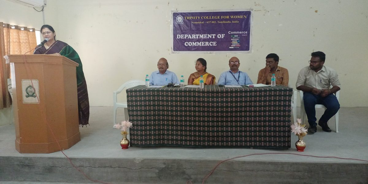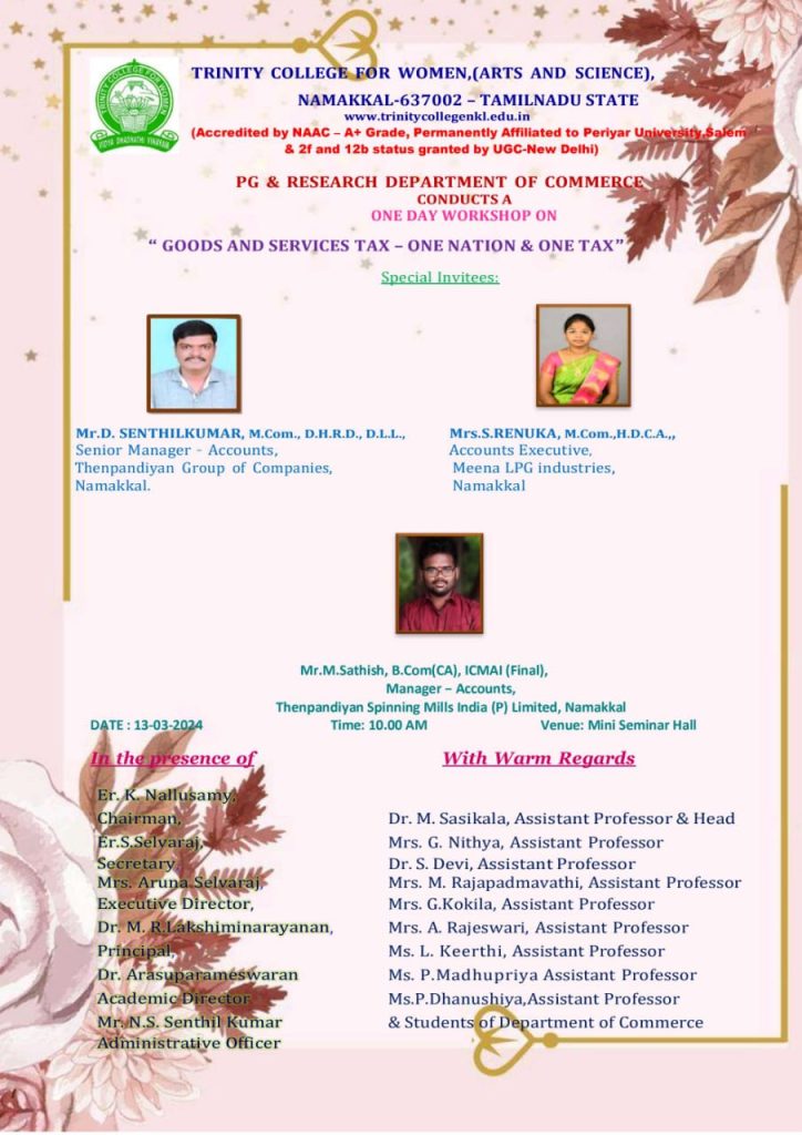 The postgraduate research department of Commerce at Trinity College for Women, Namakkal, conducts a one-day workshop on “Goods and Services Tax: One Nation and One Tax” on March 13, 2024 (Wednesday) at 10 a.m. on the college campus. Mr. D. Senthilkumar, Senior Manager, Accounts, Thenpandiyan Group of Companies, Namakkal; Mrs. S. Renuka, Accounts Executive, Meena LPG Industries, Namakkal; and Mr. M. Sathish, Manager, Accounts, Thenpandian Spinning Mills (P) Ltd., Namakkal, are the resource persons.