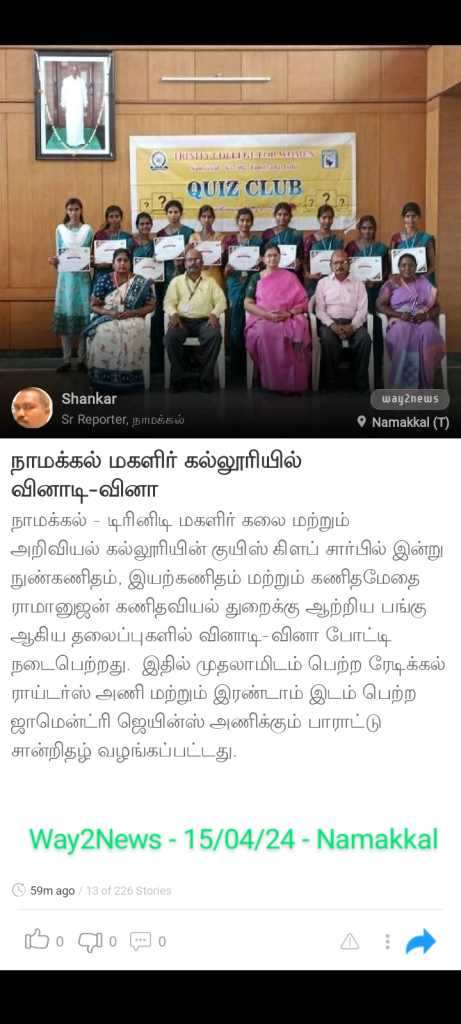 The Quiz Club of Trinity College for Women, Namakkal, conducted the Mathematics Quiz Program recently. All the questions were asked on the topics of algebra, calculus, differential equations, trigonometry, computational mathematics, Laplace transform, real analysis, mechanics, discrete mathematics, real analysis, complex analysis, graph theory, and the math genius Srinivasa Ramanujan’s contribution to mathematics.