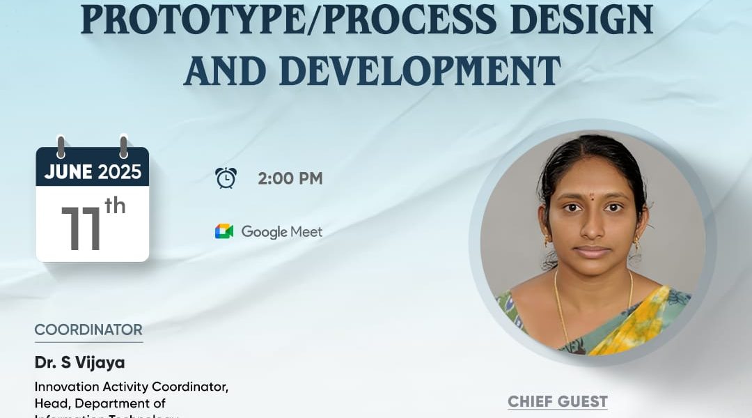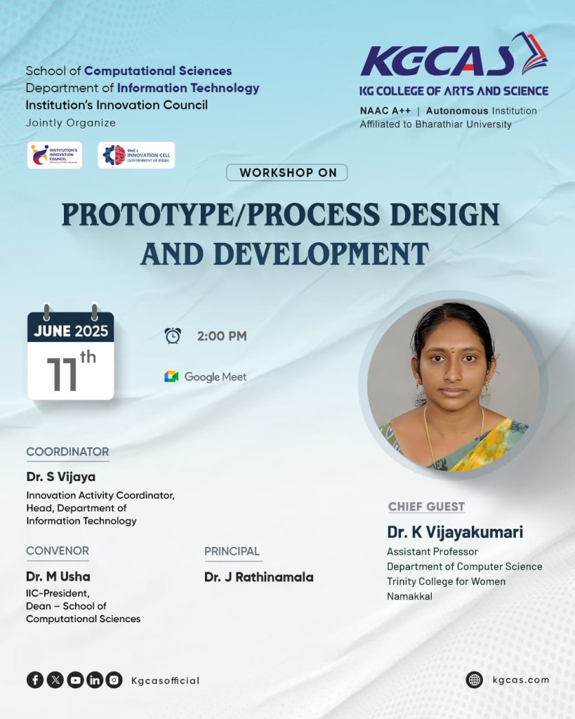 The School of Computational Science, Department of Information Technology & Institutions Innovation Council, KG College of Arts and Science, Coimbatore, conducted a webinar titled “Prototype/Process Design & Development” on 11th June 2025.