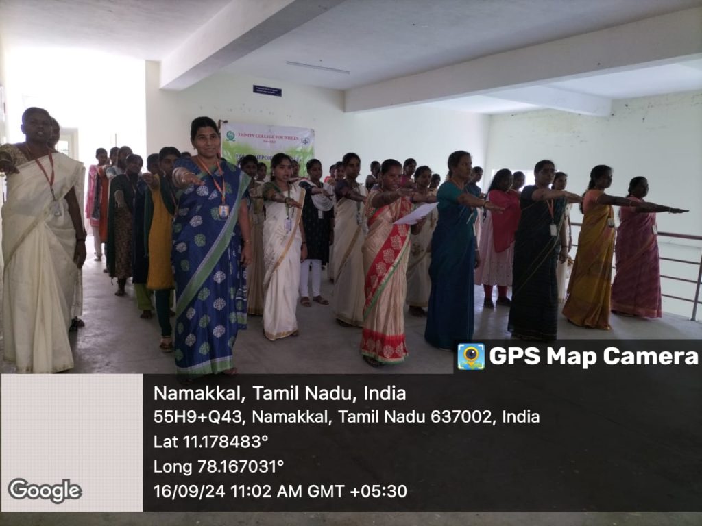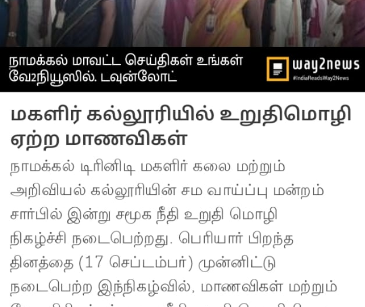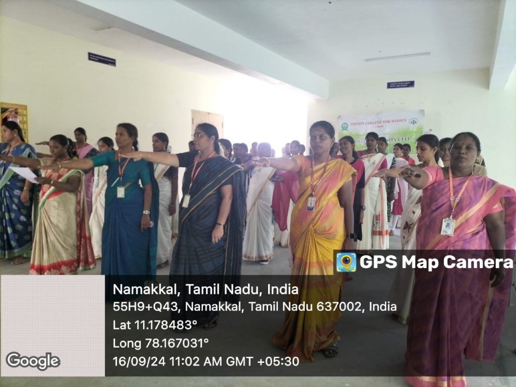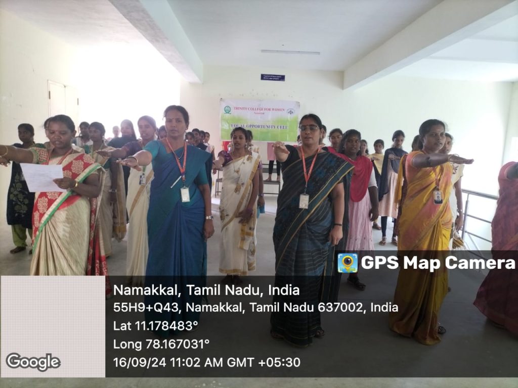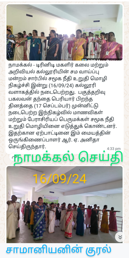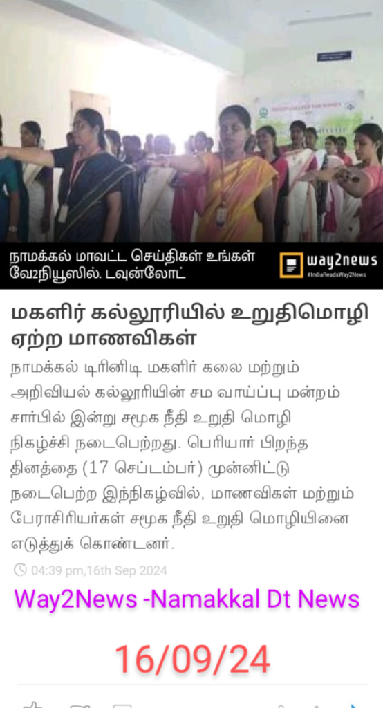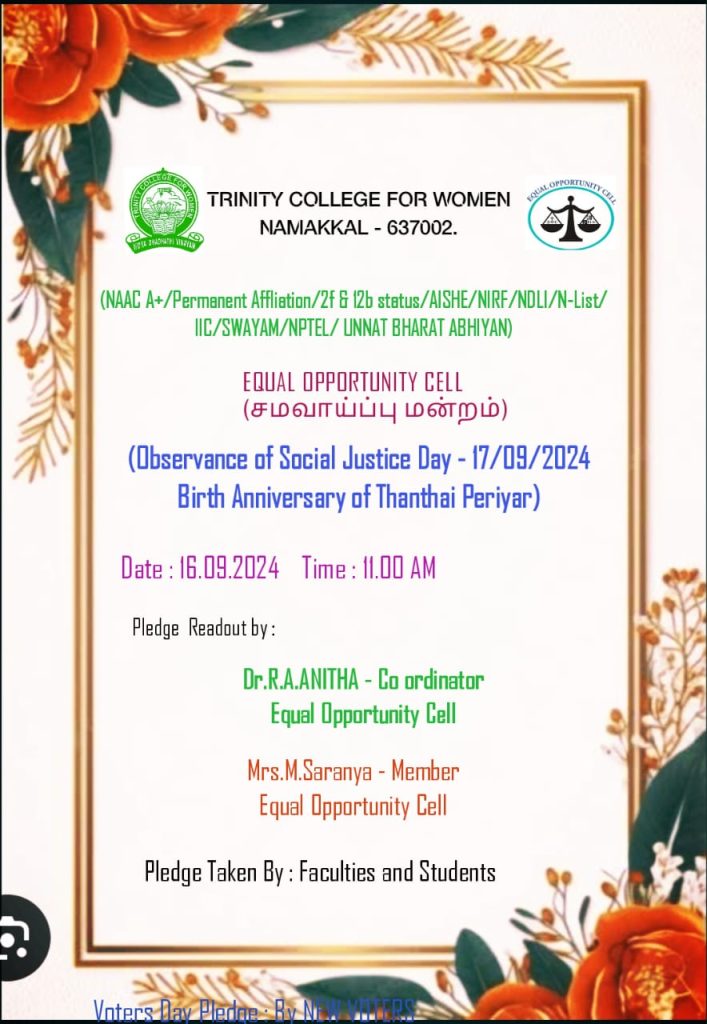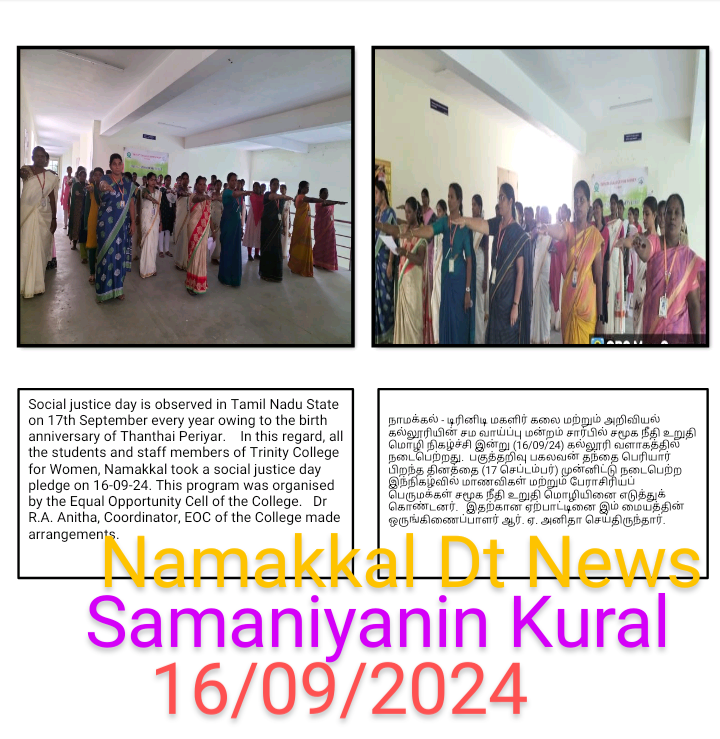 The social justice day pledge was observed in the campus of Trinity College for Women, Namakkal on 16.09.2024. On the birth anniversary of social reformer Thanthai Periyar (17th September), this event was held. All the students along with faculty members of Trinity College for Women, Namakkal took the social justice pledge on that day. To create a society without caste and religion, they pointed to that social justice pledge. This programme was arranged by Dr. R.A. Anitha, Coordinator of Equal Opportunity Cell / AP in Tamil and the Adjacent of EOC Mrs. M. Saranya, AP in English of the college.