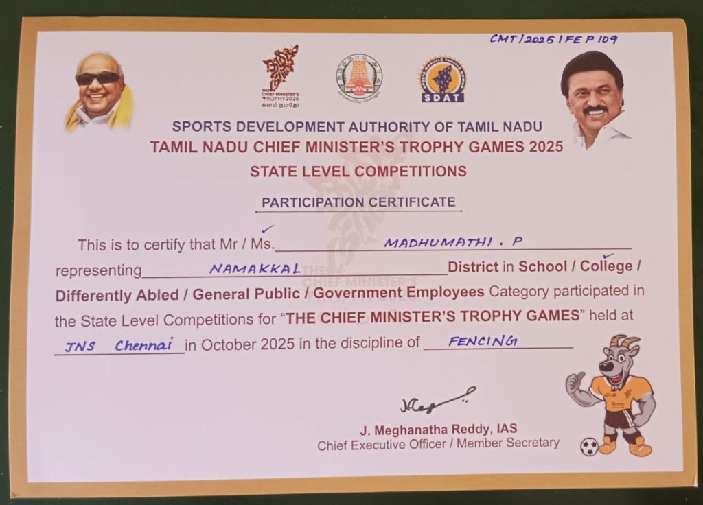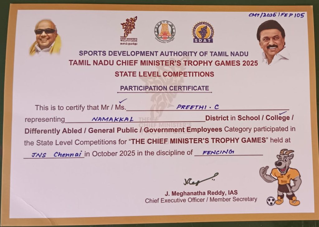 The Sports Development Authority of Tamil Nadu conducted “Tamil Nadu State Level Chief Minister’s Trophy” on 03rd October 2025. It was held in the Jawaharlal Nehru Stadium, Park Town, Chennai.