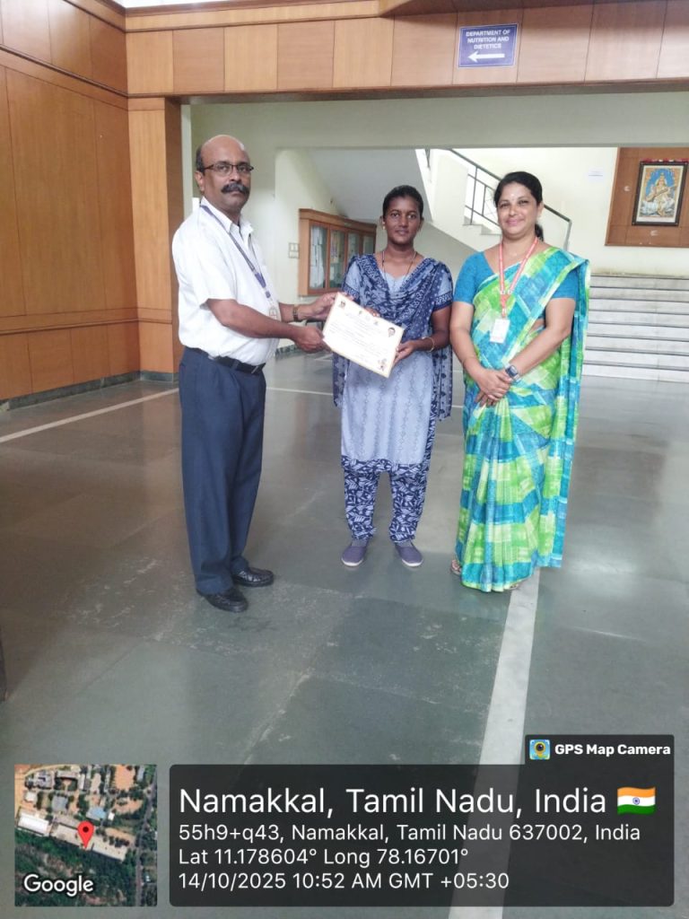 The Sports Development Authority of Tamil Nadu conducted “Tamil Nadu State Level Chief Minister’s Trophy” on 12th October 2025. It was held in the Tamil Nadu Physical Education and Sports University, Melakottaiyur, Chengalpattu District. On this subject, Ms. S. Sasikala, first year M.Sc., Mathematics student of Trinity College for Women, Namakkal actively participated in the Fencing Competition