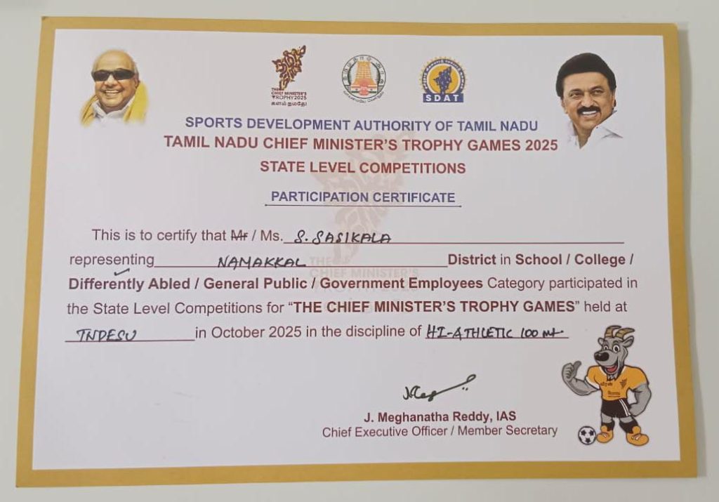 The Sports Development Authority of Tamil Nadu conducted “Tamil Nadu State Level Chief Minister’s Trophy” on 12th October 2025.   It was held in the Tamil Nadu Physical Education and Sports University, Melakottaiyur, Chengalpattu District.   On this subject, Ms. S. Sasikala, first year M.Sc., Mathematics student of Trinity College for Women, Namakkal actively participated in the Fencing Competition.