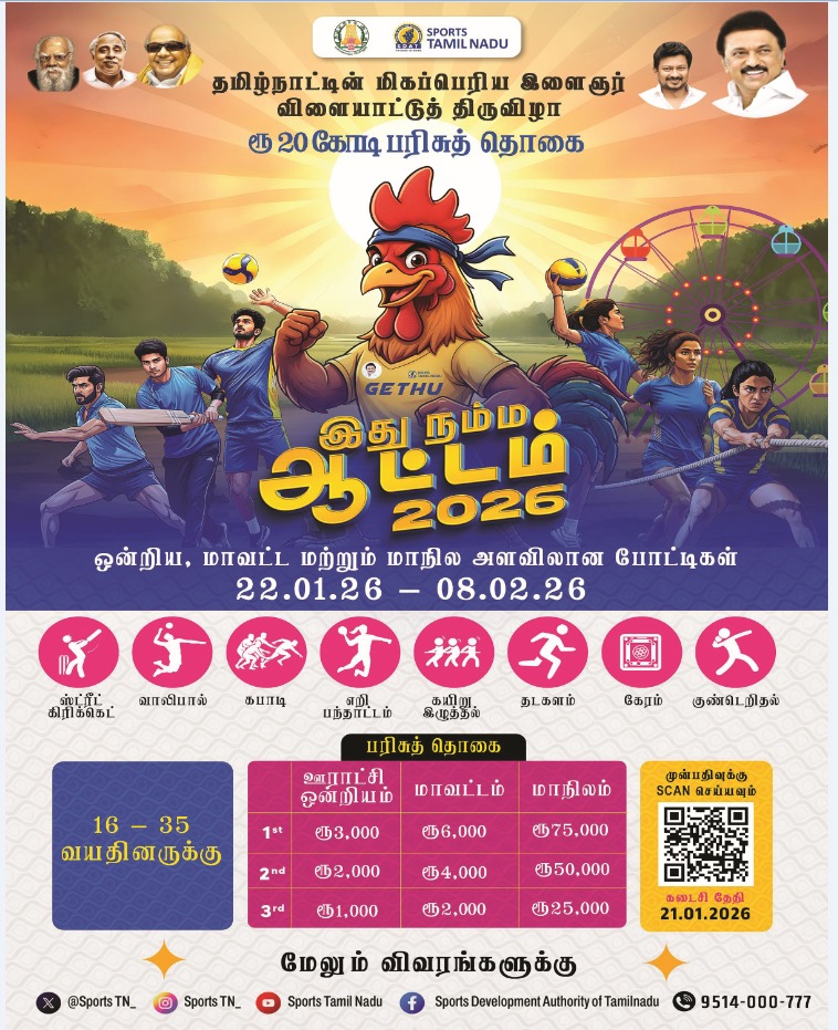The Sports Development Authority of Tamil Nadu, Namakkal District conducted “Chief Minister’s Youth Sports Festival” – (Ithu Namma Attam 2026) from 22nd January 2026 to 08th February 2026 in the venue of Prime Spiro Public School, Tiruchengode Road, Ernapuram, Namakkal.    On 26th January 2026, Athletics (100 M & Shotput), Carrom (Doubles), Tug of War, etc., were conducted.   On this subject, the students of Trinity College for Women, Namakkal actively participated and got the first place in the Athletics (100 M), Shotput and Tug of War).