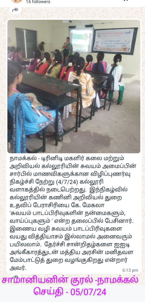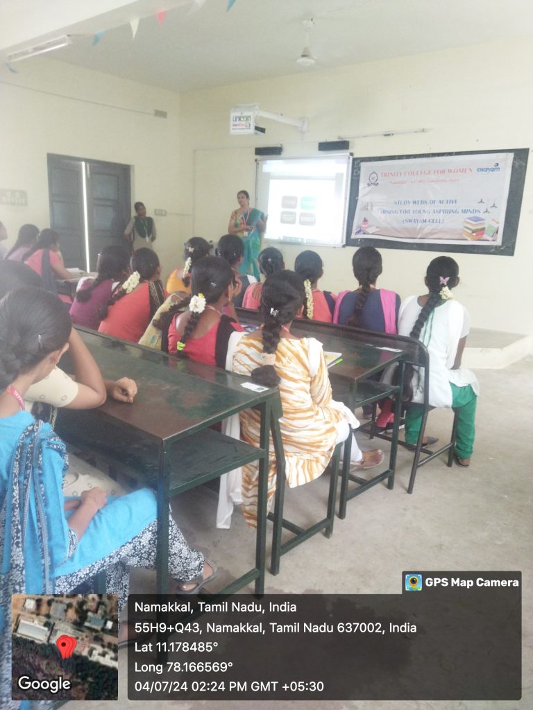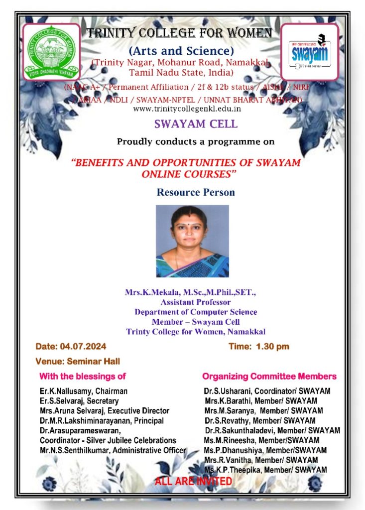 The SWAYAM Cell of Trinity College for Women, Namakkal, conducted an awareness program on July 4, 2024. Mrs. K. Mekala, Assistant Professor in Computer Science and Member of Swayam, Trinity College for Women, Namakkal, delivered the topic titled “Benefits and Opportunities of SWAYAM Online Courses.”