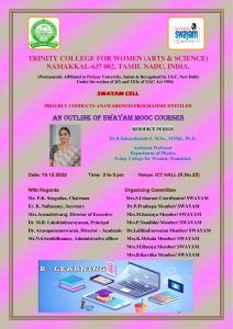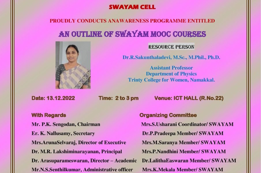 The SWAYAM Cell of Trinity College for Women, Namakkal organized an awareness event in the heading of “An outline of SWAYAM MOOC courses” on 13.12.2022. Dr. R. Sakunthaladevi, Assistant Professor in Physics, Trinity College for Women, Namakkal was the resource person. MOOCs on Indian platforms have a great future. These SWAYAM courses are another milestone in the field of higher education. MOOC courses are the best opportunity for students, especially, it is 24 x 7 hours education, she denoted. Also, she pointed out the introduction of SWAYAM courses, objectives & benefits of the courses, online web portal, details of certificate courses, norms of examination registration, submission of assignment, exam fee, etc.,