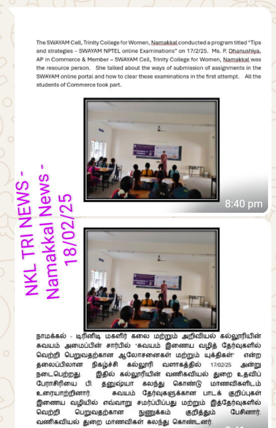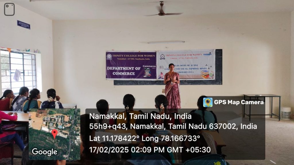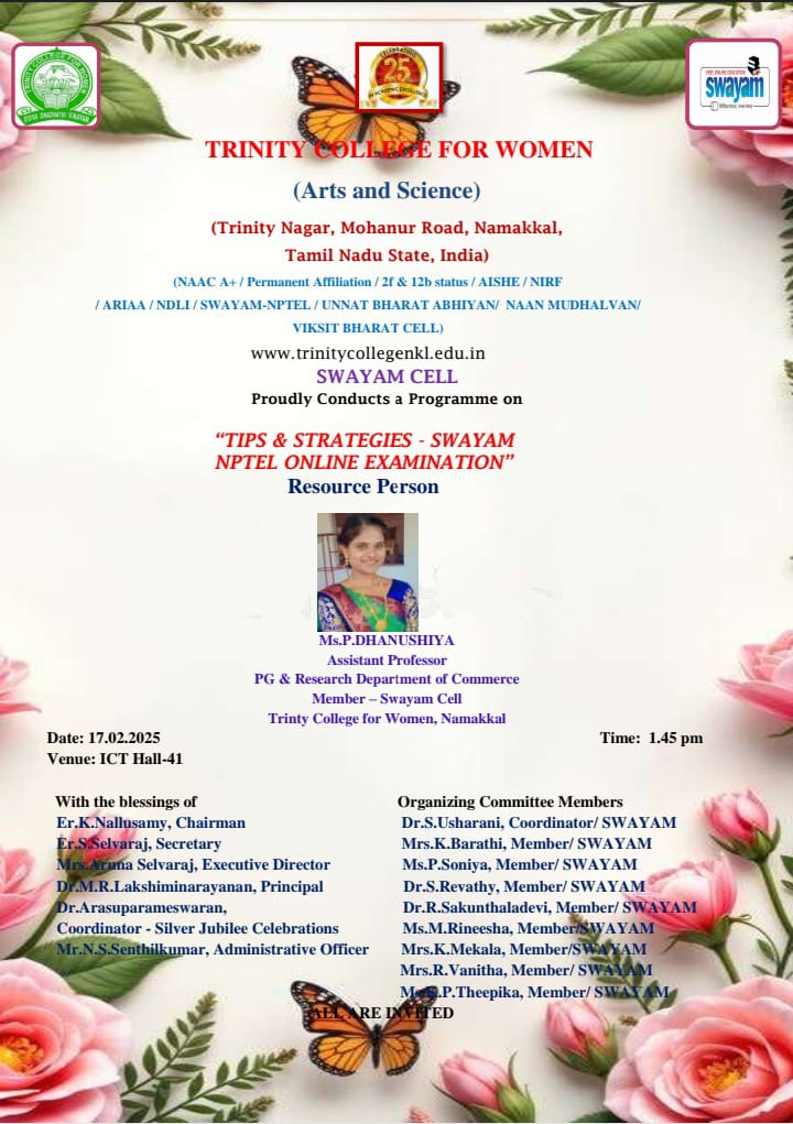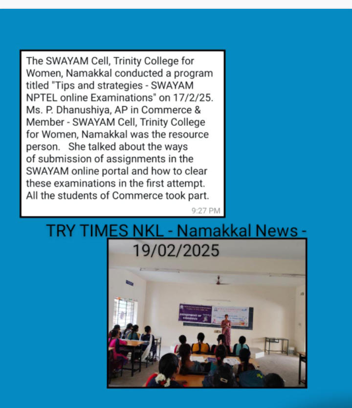 The SWAYAM Cell, Trinity College for Women, Namakkal conducted a Swayam awareness programme on 17th February 2025 in the College ICT Hall (Department of Commerce). Ms. P. Dhanushiya, Assistant Professor in Commerce & Member of SWAYAM Cell of the College delivered the topic titled “Tips & Strategies – SWAYAM Online Examinations”. She spoke about the techniques of preparation for the SWAYAM Examinations, tools of the trade for these Examinations and the benefits of the Courses. All the students of Commerce benefited through that programme.