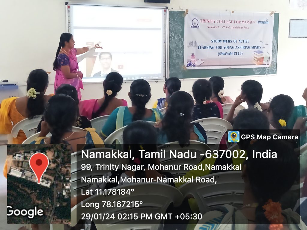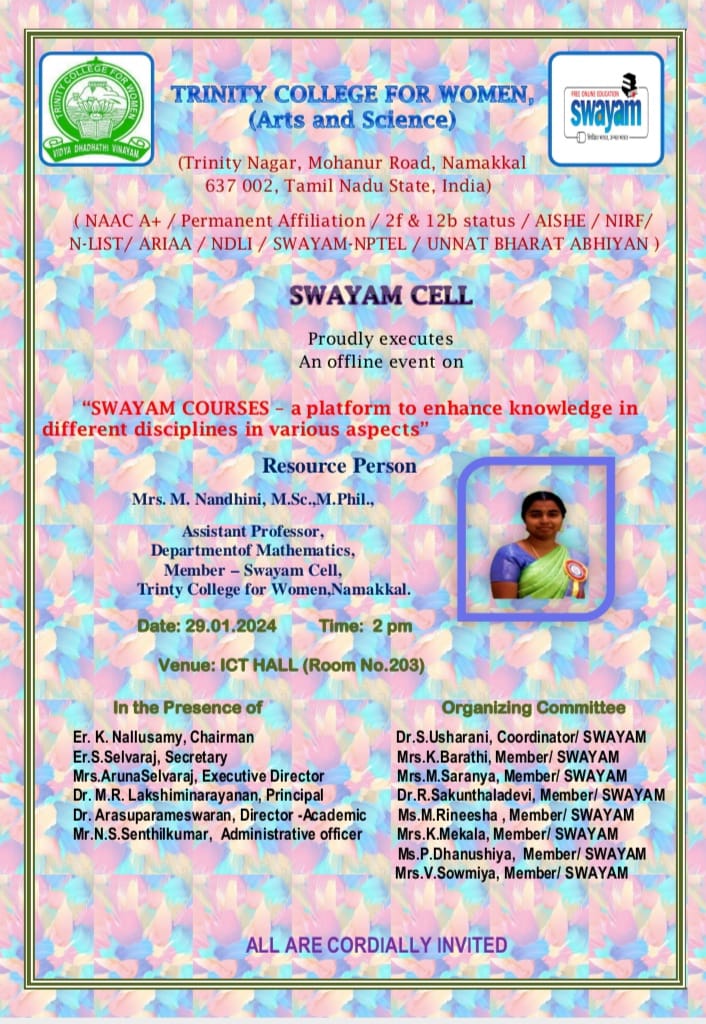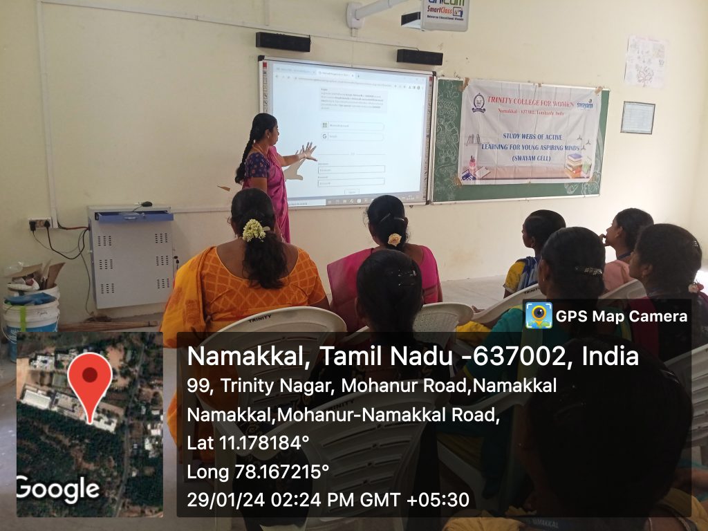 The Swayam Cell, Trinity College for Women, Namakkal, conducted a swayam online examination awareness program on January 29, 2024, in the ICT hall of Science Block. Mrs. M. Nandhini, Assistant Professor in Mathematics and Member of SWAYAM Cell, Trinity College for Women, Namakkal, delivered the topic titled “SWAYAM Courses: A Platform to Enhance Knowledge in Different Disciplines in Various Aspects.”