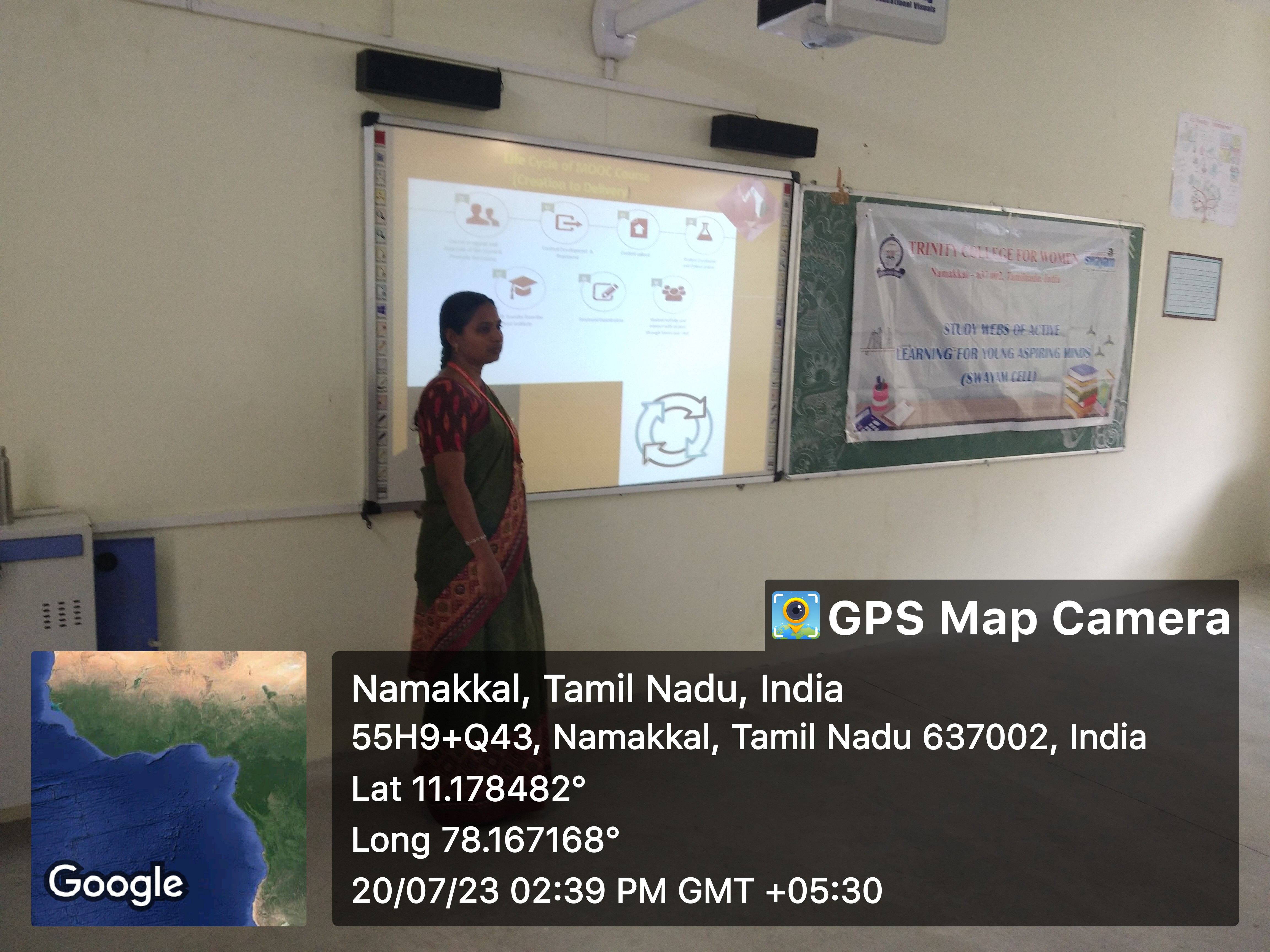 The SWAYAM Cell, Trinity College for Women, Namakkal executed an offline event entitled “Registering the NPTL – SWAYAM online courses – life hack” on 20.07.2023. Mrs. K. Mekala, Assistant Professor in Computer Science/Member –SWAYAM Cell and Dr. R. Sakunthaladevi, Assistant Professor in Physics/ Member –SWAYAM Cell, Trinity College for Women were the resource persons.