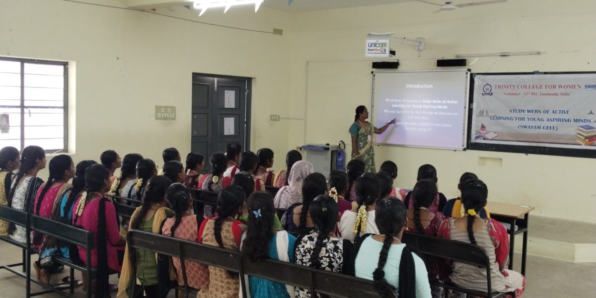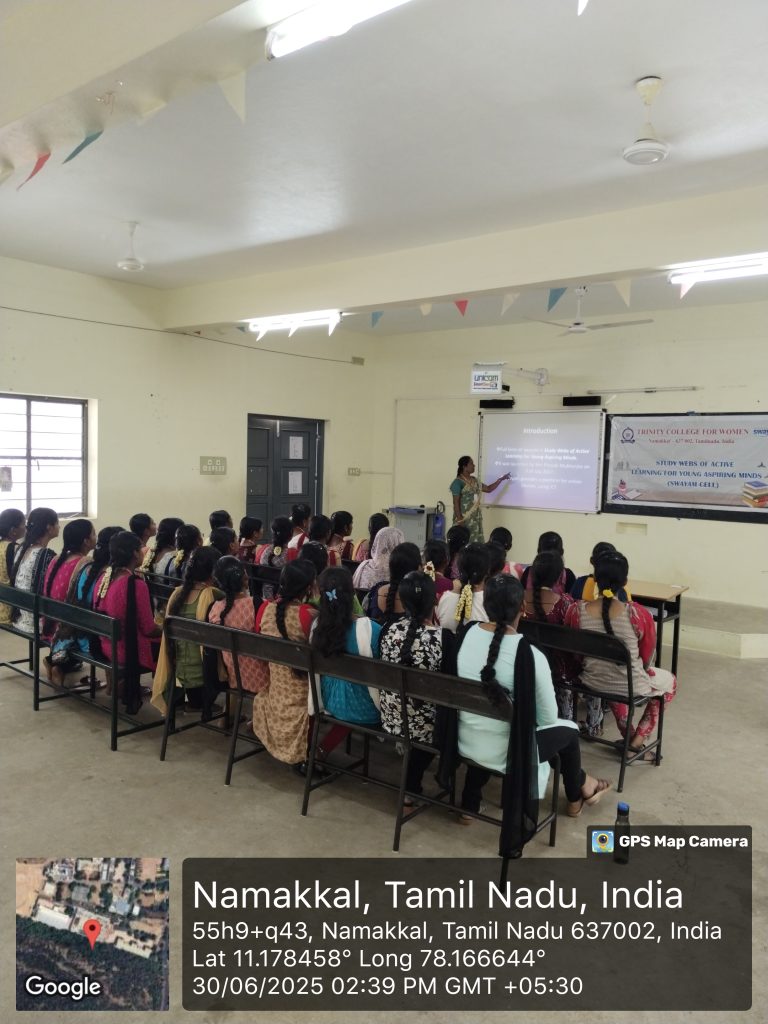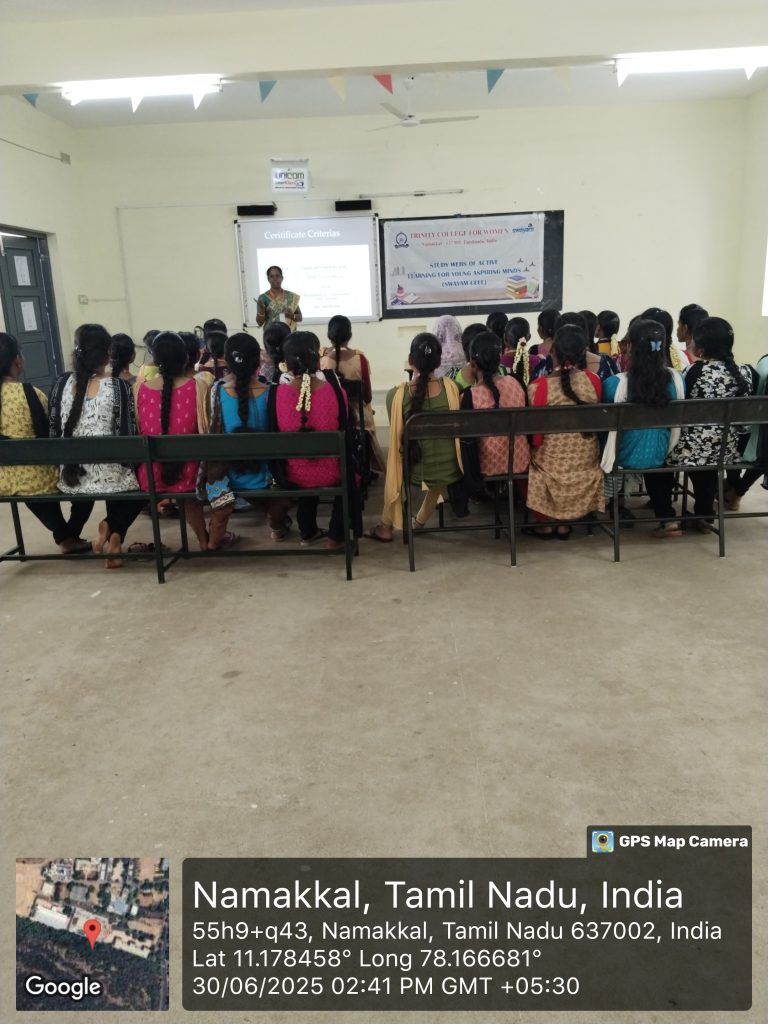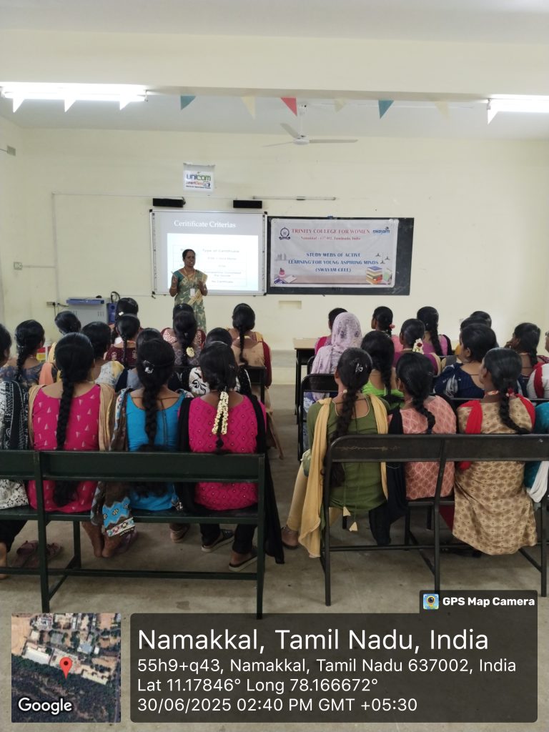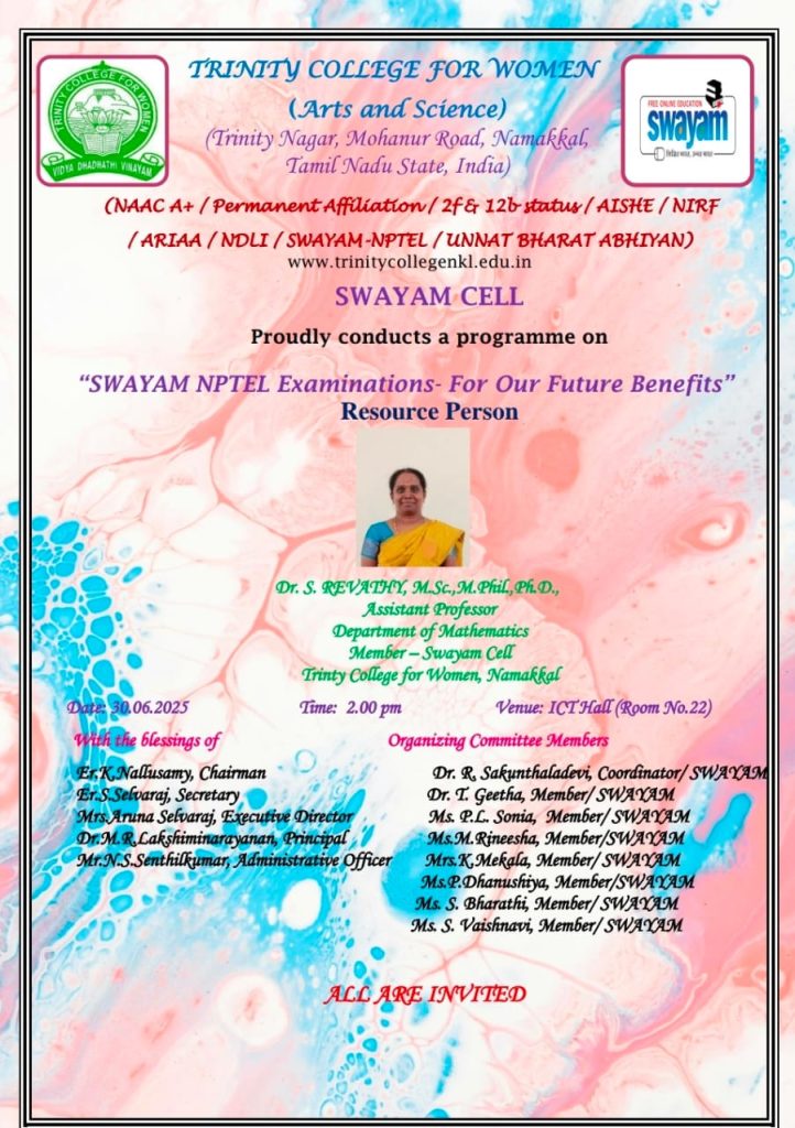 The SWAYAM Cell, Trinity College for Women, Namakkal organised a programme titled ““SWAYAM – NPTEL Examinations – For our future benefits” on 30th June 2025 in the College campus. Dr. S. Revathy, Assistant Professor of Mathematics & Member – Swayam Cell, Trinity College for Women, Namakkal was the resource person. These NPTEL virtual examinations are conducted by the Ministry of Human Resource Development, Government of India. These certificates are very valuable. These certificates provide an opportunity for getting admission to higher educational institutions and employment preference will be given to SWAYAM Certificate holders.