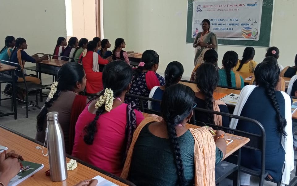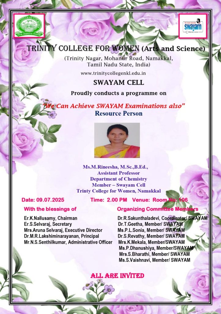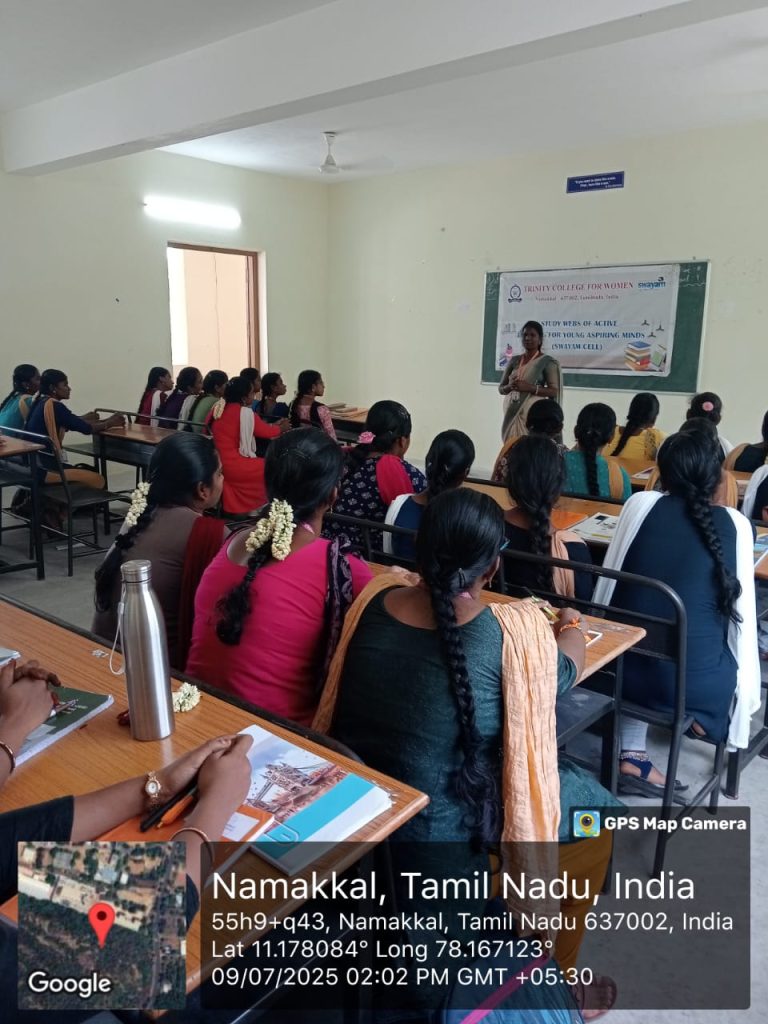 The SWAYAM Cell, Trinity College for Women, Namakkal organized a programme entitled ”We can achieve SWAYAM Examinations also” on 09.07.2025. Ms. M. Rineesha, Assistant Professor in Chemistry & Member – SWAYAM Cell, Trinity College for Women, Namakkal was the resource person.