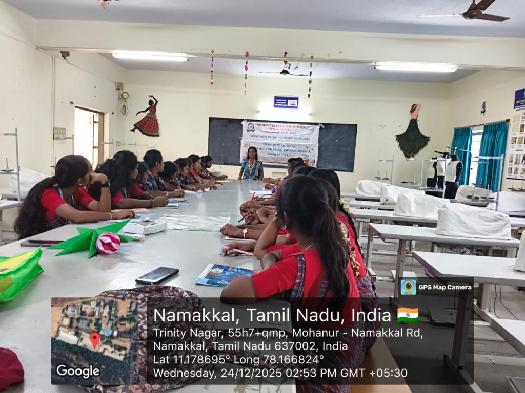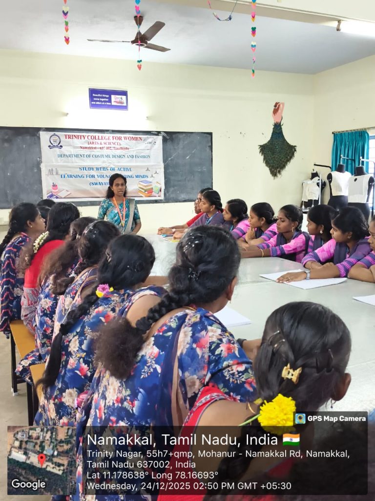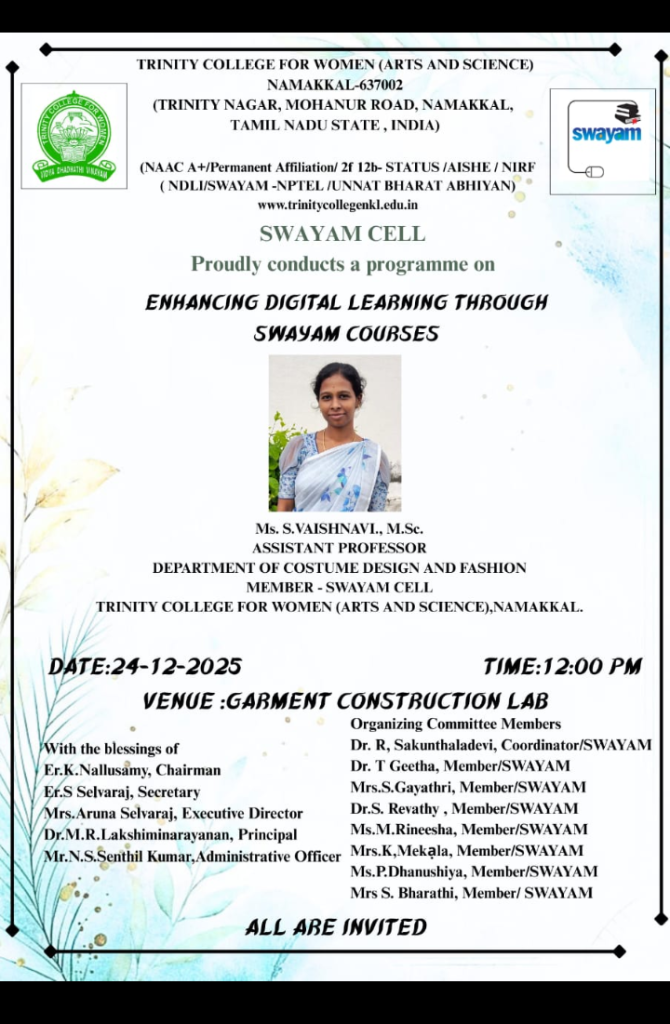 The SWAYAM Cell, Trinity College for Women, Namakkal organized a programme titled “Enhancing Digital Learning through Swayam Courses” on 23rd December 2025 in the College premises. Ms. S. Vaishnavi, Assistant Professor in Costume Design and Fashion & Member – SWAYAM Cell, Trinity College for Women, Namakkal was the resource person.