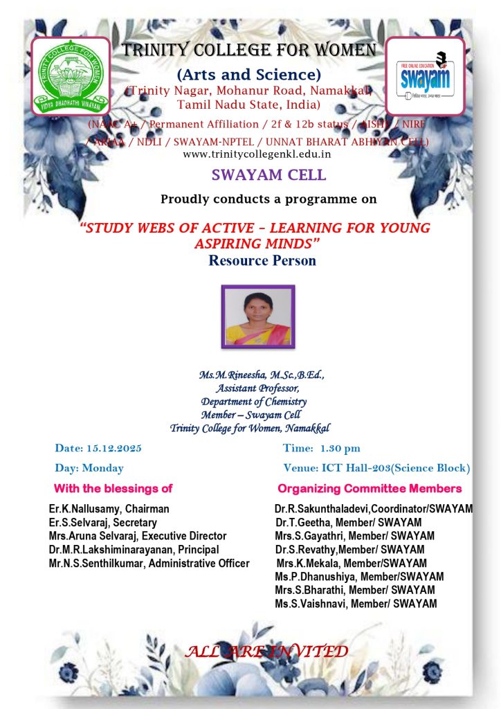 The Swayam Cell, Trinity College for Women, Namakkal, organized a programme titled “Study Webs of Active – Learning for Young Aspiring Mind” on 15.12.2025.
