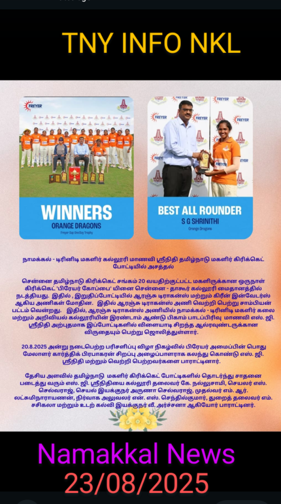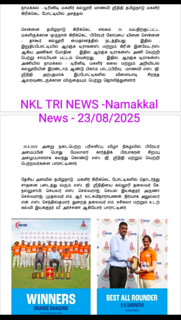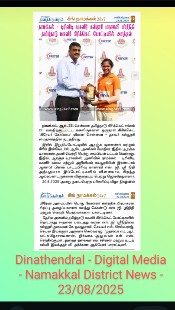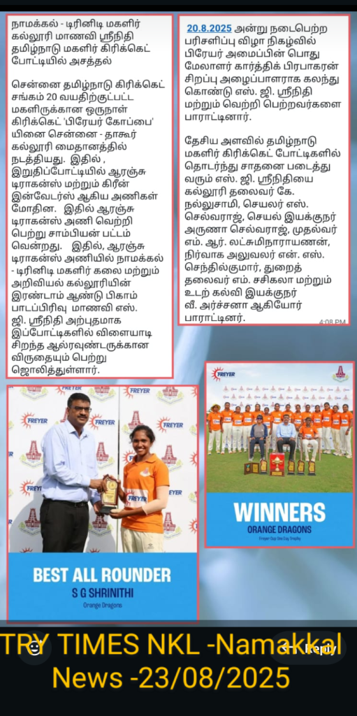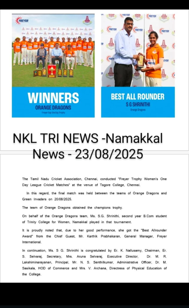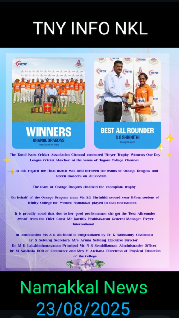 The Tamil Nadu Cricket Association, Chennai conducted “Freyar Trophy – Women’s T20 League Matches” at the venue of Tagore College, Chennai. On 20th August 2025, the final cricket match was held between the Orange Dragons and Green Invaders. On behalf of Orange Dragons, Ms. S.G. Shrinithi, second year B.Com., student, Trinity College for Women, Namakkal was played.