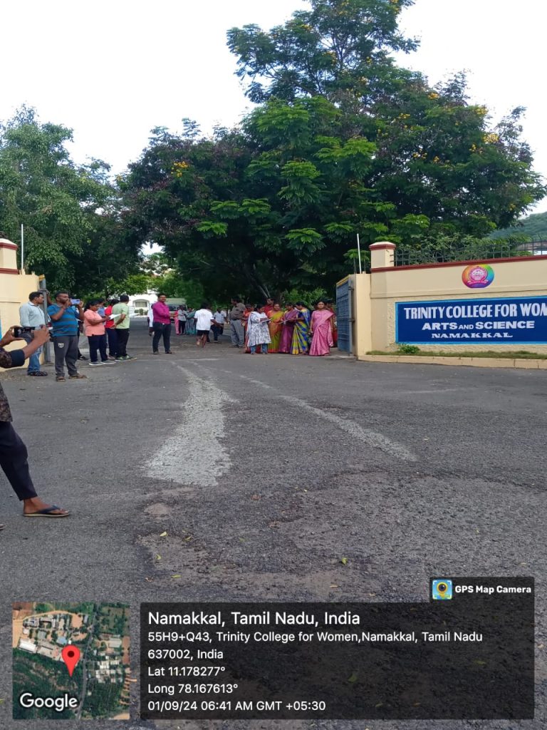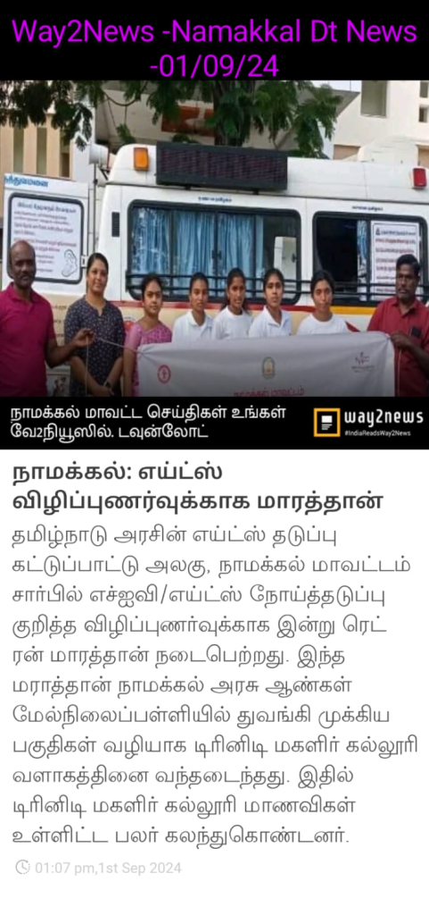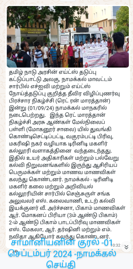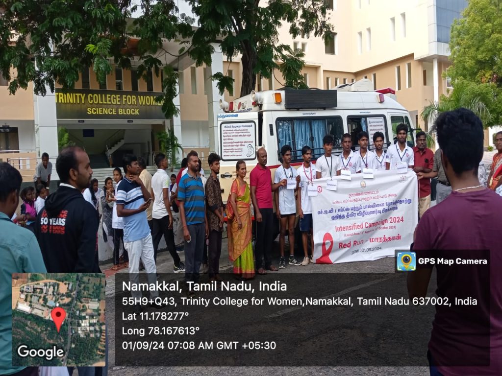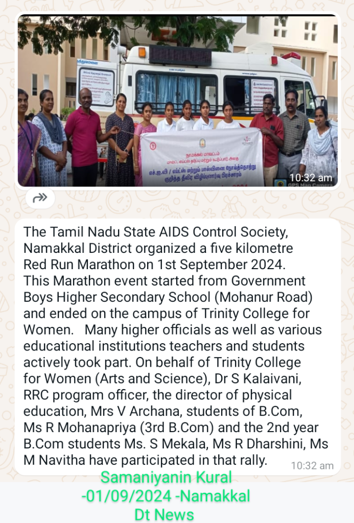 The Tamil Nadu State AIDS Control Society, Namakkal District organized a five kilometre Red Run Marathon on 01st September 2024. This Marathon Event started from Government Boys Higher Secondary School (Mohanur Road) and ended on the campus of Trinity College for Women, Namakkal. This programme was inaugurated by Mr. S. Selvakumar, District Programme Manager, Namakkal District and also many higher officials of Namakkal District participated. On behalf of Trinity College for Women, Namakkal, Dr. S. Kalaivani, RRC Programme Officer, Mrs. V. Archana, Physical Directress and the Students of Commerce Ms. R. Mohanapriya (III B.Com.,), the second year B.Com., students Ms. S. Mekala, Ms. R. Dharshini and Ms. M. Navitha also took part in that Red Run Marathon Programme.
