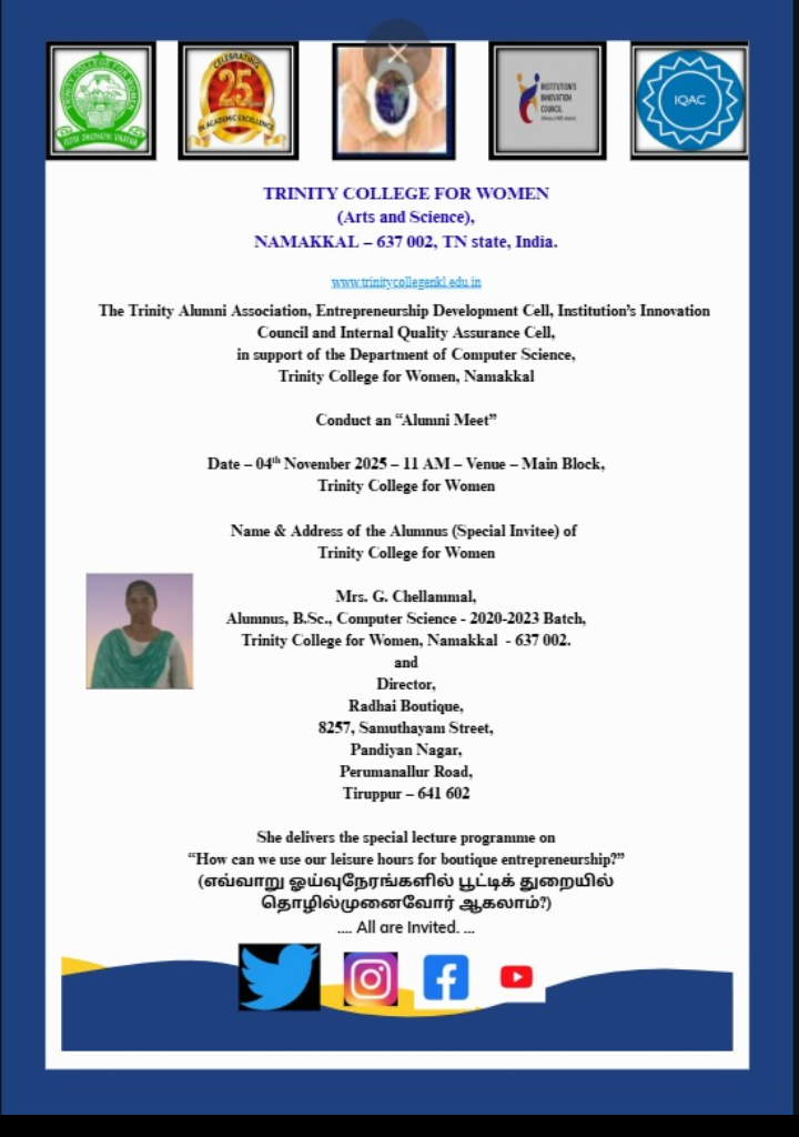 The Trinity Alumni Association, Entrepreneurship Development Cell, the Institution’s Innovation Council and Internal Quality Assurance Cell, in support of the Department of Computer Science, Trinity College for Women, Namakkal conducted an Alumni Meet on 04th November 2025 at the College Campus.