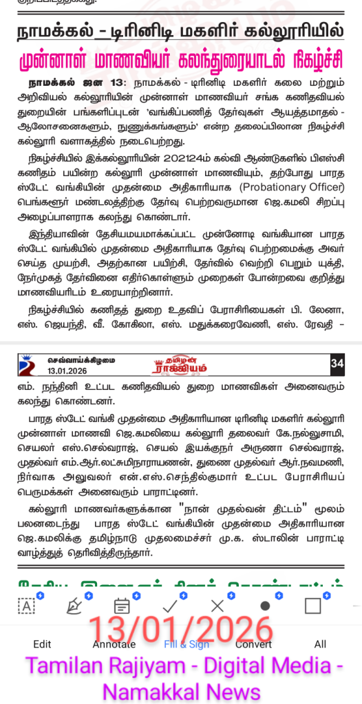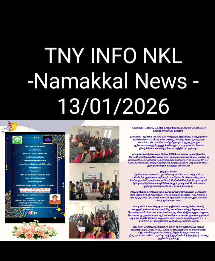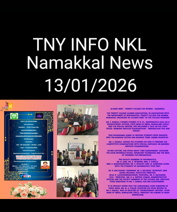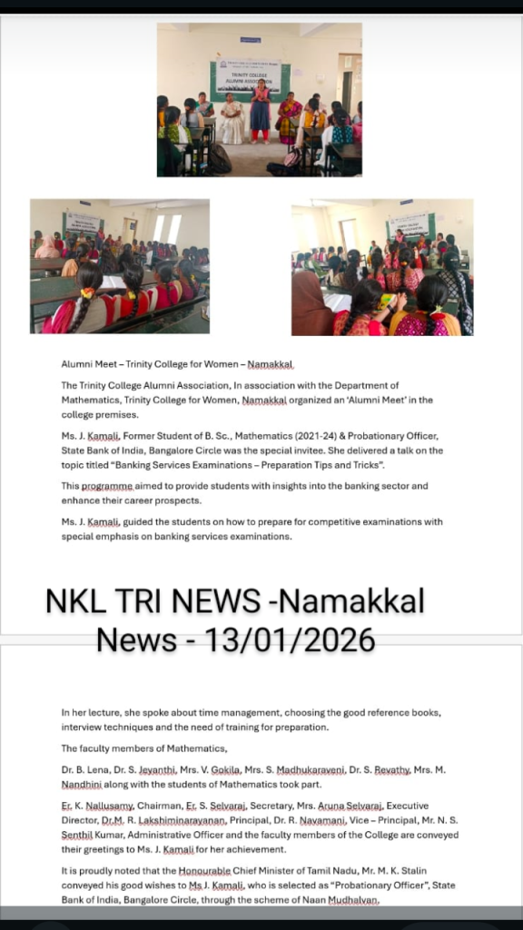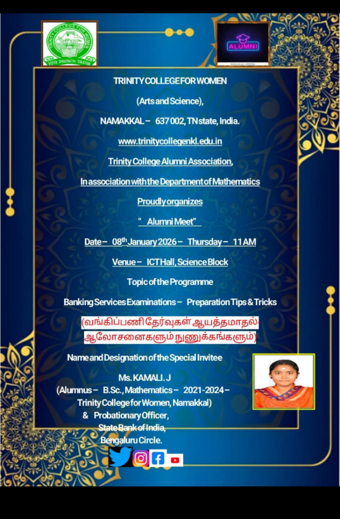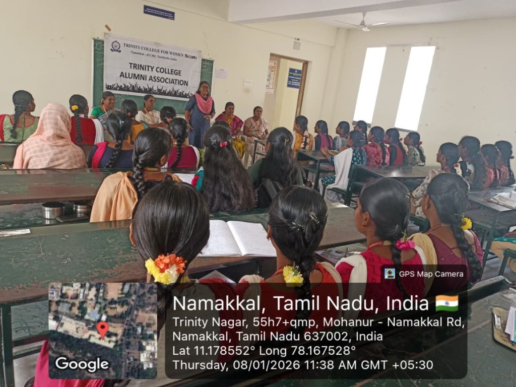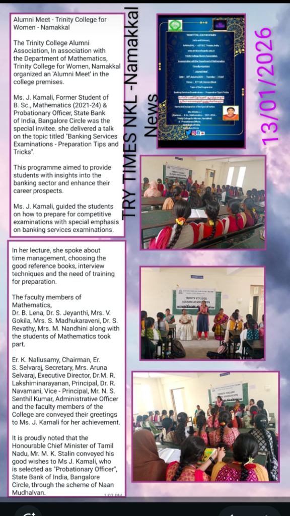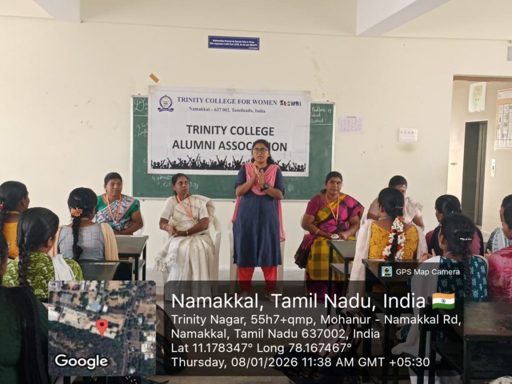 The Trinity College Alumni Association, in association with the Department of Mathematics, Trinity College for Women, Namakkal, organized an “Alumni Meet” on 08.01.2026 in the College premises.
