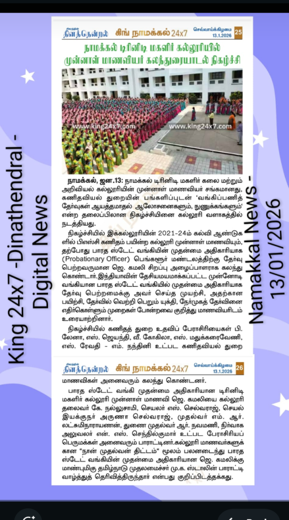 Ms. J. Kamali, Alumnus – B.Sc., Mathematics (2021-2024), Trinity College for Women, Namakkal and Probationary Officer, State Bank of India, Bengaluru Circle was the special invitee.