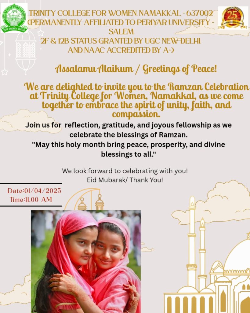 The Trinity College for Women, Namakkal, joyfully celebrated the Ramzan festival on 01st April 2025 in the College premises. The main aim of the celebrations is to respect all religious faiths. With respect to the Islamic religion, a prayer service was conducted. Students of the college joined in breaking the fast. Ms. Tahani Naveeth, final year B.Com., CA & Chairman of Trinity College for Women, Namakkal, highlighted the significance of the holy month of Ramzan and the importance of fasting. Students conveyed their “EID-MUBARAK GREETINGS” to all.